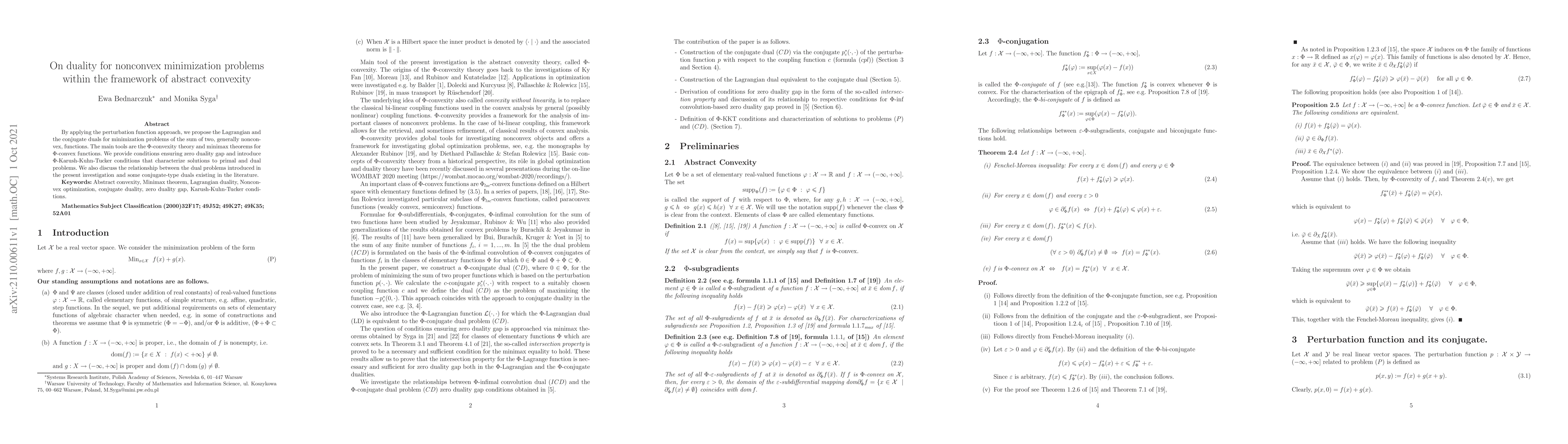 By applying the perturbation function approach, we propose the Lagrangian and the conjugate duals for minimization problems of the sum of two, generally nonconvex, functions. The main tools are the $\Phi$-convexity theory and minimax theorems for $\Phi$-convex functions. We provide conditions ensuring zero duality gap and introduce $\Phi$-Karush-Kuhn-Tucker conditions that characterize solutions to primal and dual problems. We also discuss the relationship between the dual problems introduced in the present investigation and some conjugate-type duals existing in the literature.