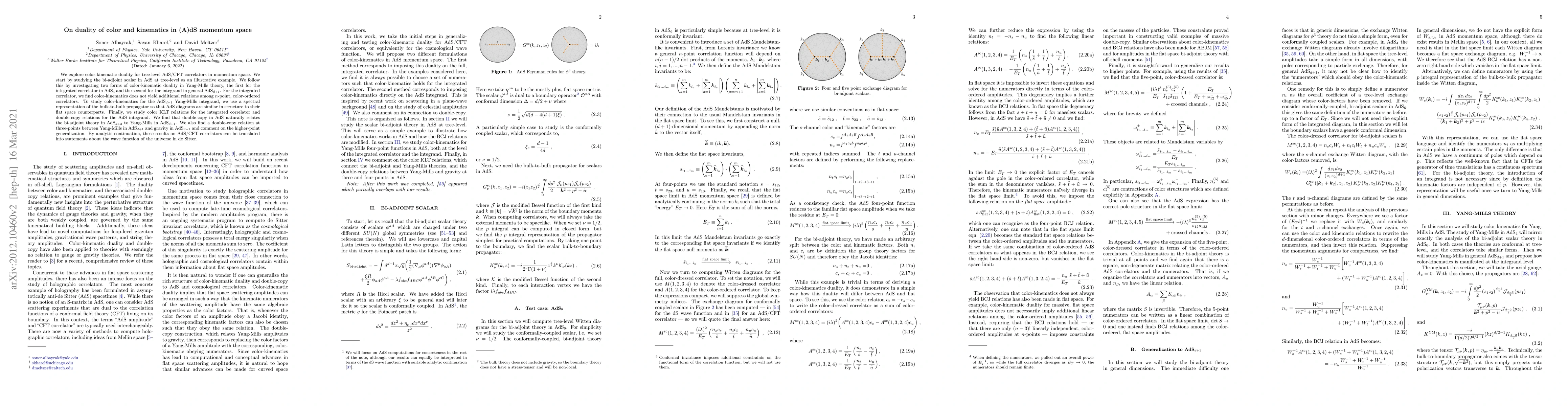 We explore color-kinematic duality for tree-level AdS/CFT correlators in momentum space. We start by studying the bi-adjoint scalar in AdS at tree-level as an illustrative example. We follow this by investigating two forms of color-kinematic duality in Yang-Mills theory, the first for the integrated correlator in AdS$_4$ and the second for the integrand in general AdS$_{d+1}$. For the integrated correlator, we find color-kinematics does not yield additional relations among $n$-point, color-ordered correlators. To study color-kinematics for the AdS$_{d+1}$ Yang-Mills integrand, we use a spectral representation of the bulk-to-bulk propagator so that AdS diagrams are similar in structure to their flat space counterparts. Finally, we study color KLT relations for the integrated correlator and double-copy relations for the AdS integrand. We find that double-copy in AdS naturally relates the bi-adjoint theory in AdS$_{d+3}$ to Yang-Mills in AdS$_{d+1}$. We also find a double-copy relation at three-points between Yang-Mills in AdS$_{d+1}$ and gravity in AdS$_{d-1}$ and comment on the higher-point generalization. By analytic continuation, these results on AdS/CFT correlators can be translated into statements about the wave function of the universe in de Sitter.