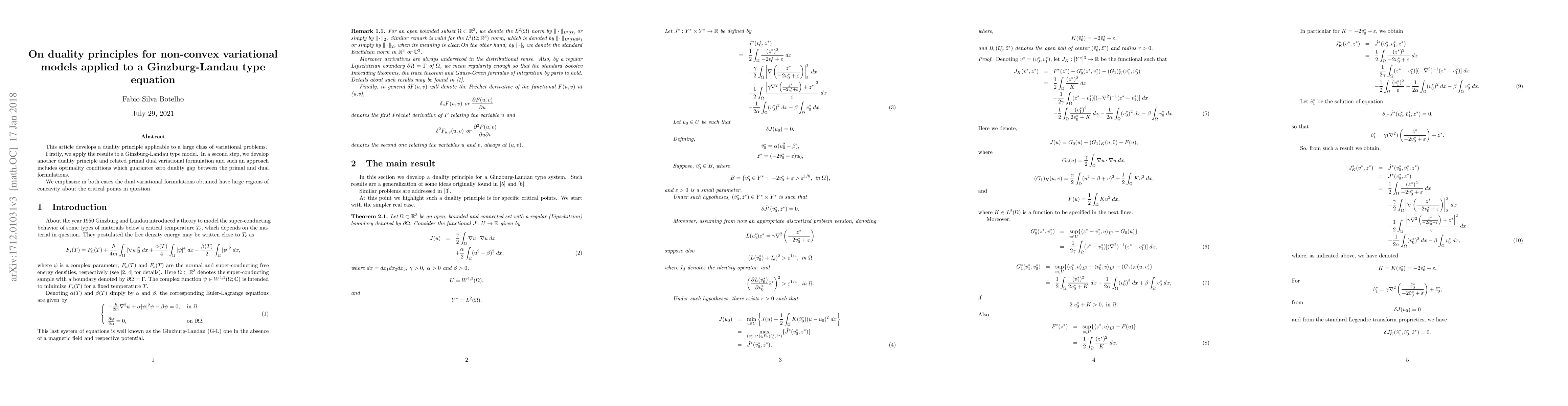 This article develops a duality principle applicable to a large class of variational problems. Firstly, we apply the results to a Ginzburg-Landau type model. In a second step, we develop another duality principle and related primal dual variational formulation and such an approach includes optimality conditions which guarantee zero duality gap between the primal and dual formulations. We emphasize in both cases the dual variational formulations obtained have large regions of concavity about the critical points in question.