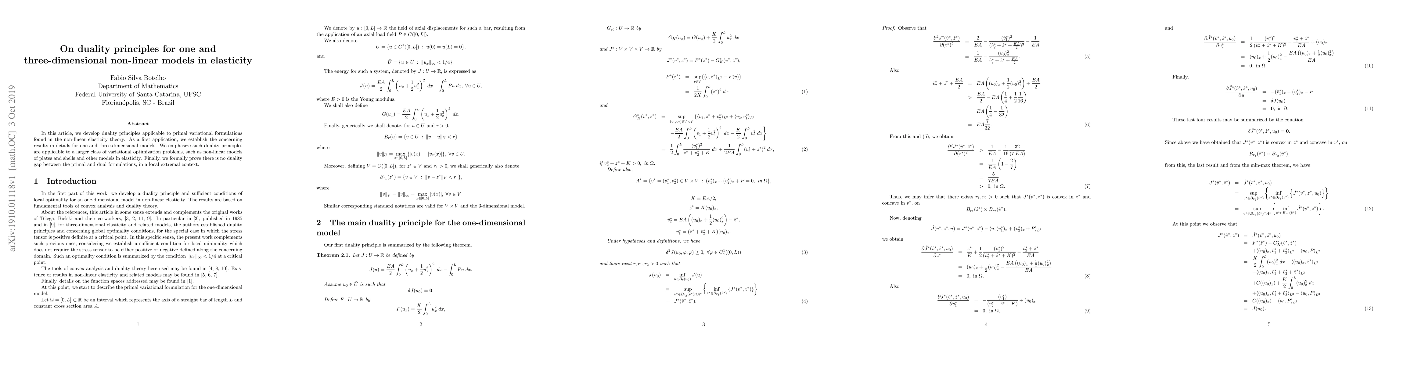 This paper develops duality principles for primal variational formulations in non-linear elasticity theory, applying them to one and three-dimensional models, and proves the absence of duality gaps in local extremal contexts. The principles extend to broader variational optimization problems in elasticity, including plates and shells.