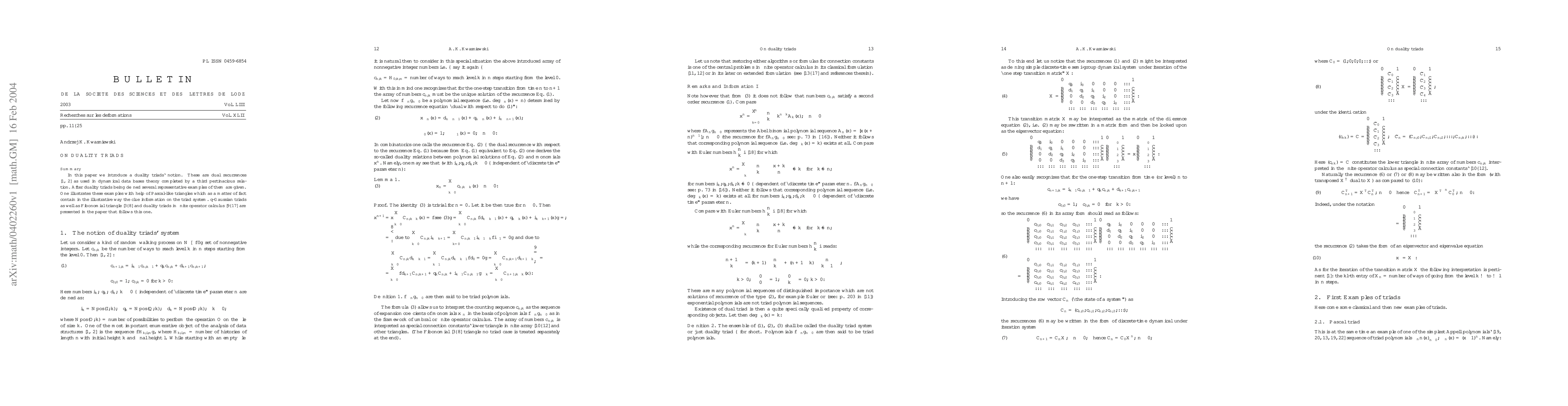 We introduce a duality triads` notion. These are dual recurrences as used in dynamical data bases theory completed by a third pertinacious relation. Several representative examples of them are given. q-Gaussian triads as well as Fibonomial triangle and duality triads in finite operator calculus are presented in the paper that follows this one .