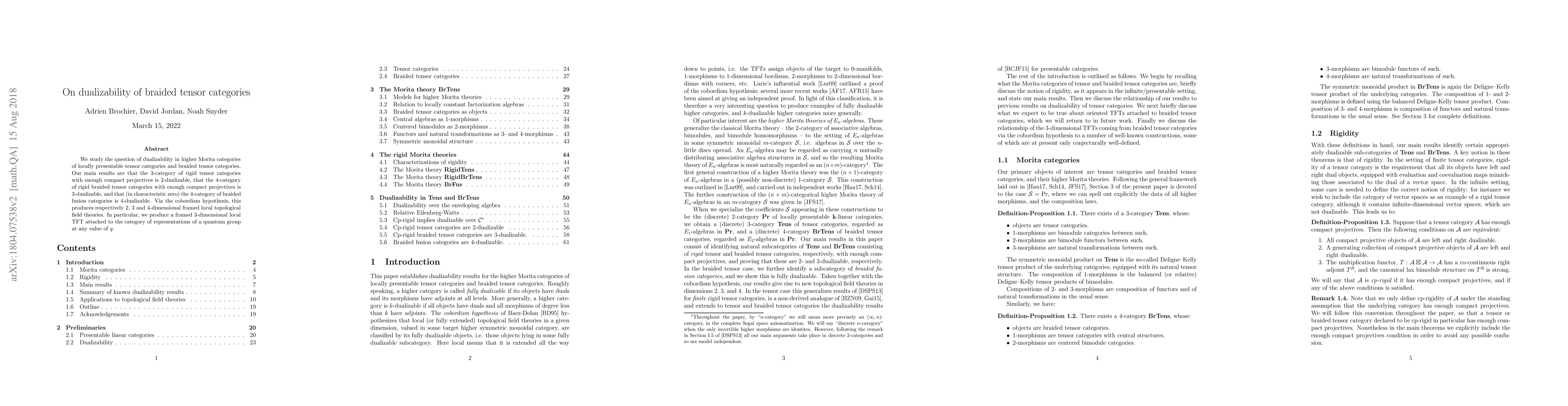 We study the question of dualizability in higher Morita categories of locally presentable tensor categories and braided tensor categories. Our main results are that the 3-category of rigid tensor categories with enough compact projectives is 2-dualizable, that the 4-category of rigid braided tensor categories with enough compact projectives is 3-dualizable, and that (in characteristic zero) the 4-category of braided fusion categories is 4-dualizable. Via the cobordism hypothesis, this produces respectively 2, 3 and 4-dimensional framed local topological field theories. In particular, we produce a framed 3-dimensional local TFT attached to the category of representations of a quantum group at any value of $q$.