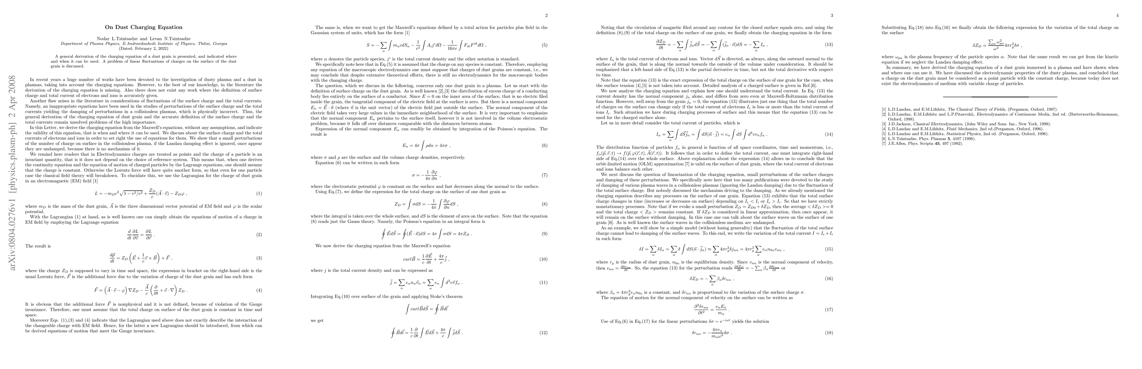 Summary: This paper presents a comprehensive derivation of the dust grain charging equation, outlining its applicability and addressing the issue of linear charge fluctuations on the dust grain surface. The study aims to clarify the mechanisms governing dust charge dynamics.