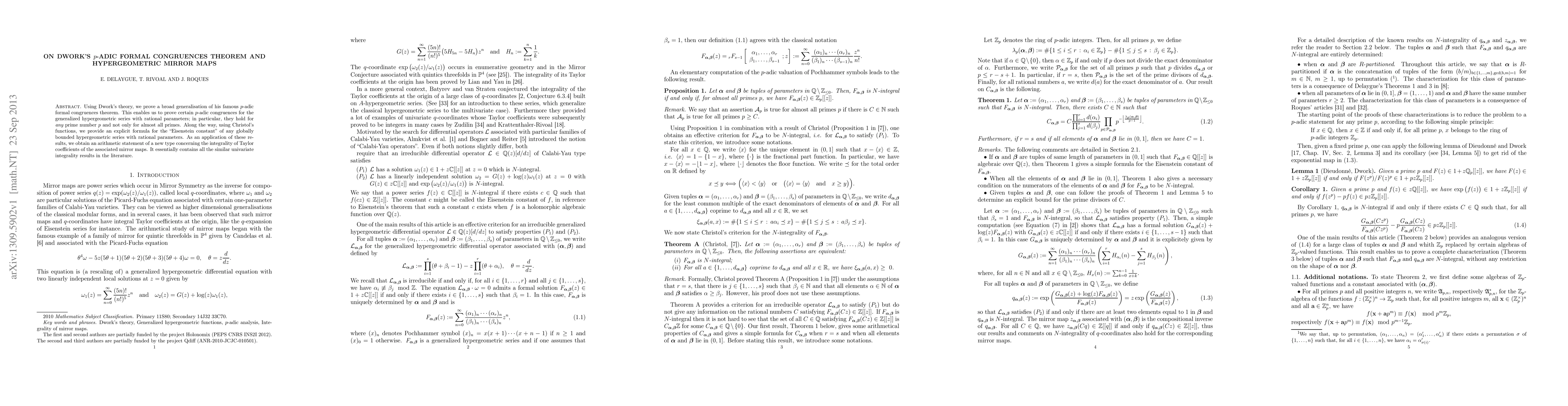 Using Dwork's theory, we prove a broad generalisation of his famous p-adic formal congruences theorem. This enables us to prove certain p-adic congruences for the generalized hypergeometric series with rational parameters; in particular, they hold for any prime number p and not only for almost all primes. Along the way, using Christol's functions, we provide an explicit formula for the "Eisenstein constant" of any globally bounded hypergeometric series with rational parameters. As an application of these results, we obtain an arithmetic statement of a new type concerning the integrality of Taylor coefficients of the associated mirror maps. It essentially contains all the similar univariate integrality results in the litterature.