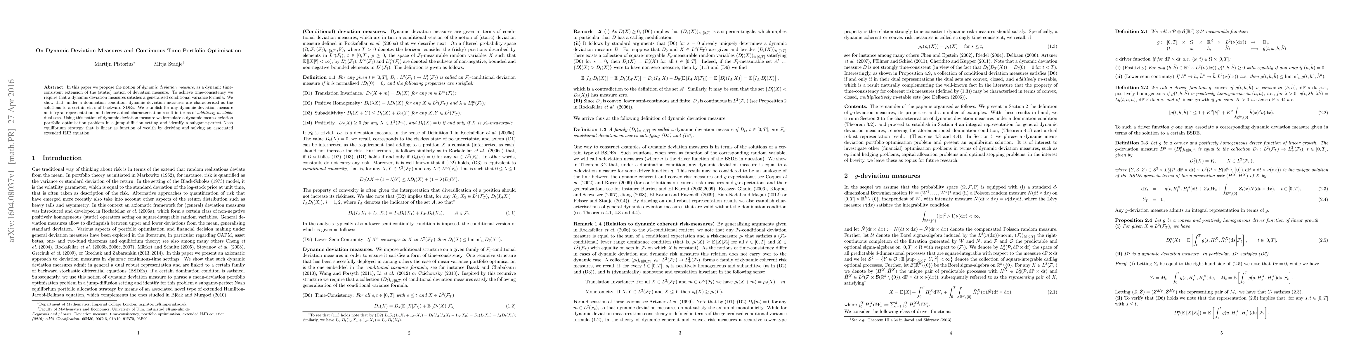 In this paper we propose the notion of dynamic deviation measure, as a dynamic time-consistent extension of the (static) notion of deviation measure. To achieve time-consistency we require that a dynamic deviation measures satisfies a generalised conditional variance formula. We show that, under a domination condition, dynamic deviation measures are characterised as the solutions to a certain class of backward SDEs. We establish for any dynamic deviation measure an integral representation, and derive a dual characterisation result in terms of additively $m$-stable dual sets. Using this notion of dynamic deviation measure we formulate a dynamic mean-deviation portfolio optimisation problem in a jump-diffusion setting and identify a subgame-perfect Nash equilibrium strategy that is linear as function of wealth by deriving and solving an associated extended HJB equation.