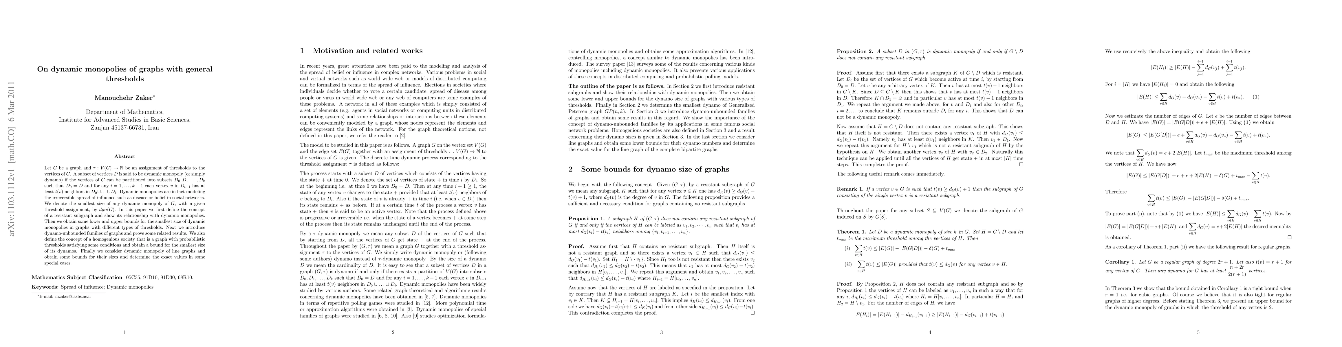 The paper defines dynamic monopolies in graphs with general thresholds, introduces resistant subgraphs, and establishes bounds for dynamic monopolies in various threshold types. It also explores dynamo-unbounded families and homogenious societies, and analyzes dynamic monopolies in line graphs.