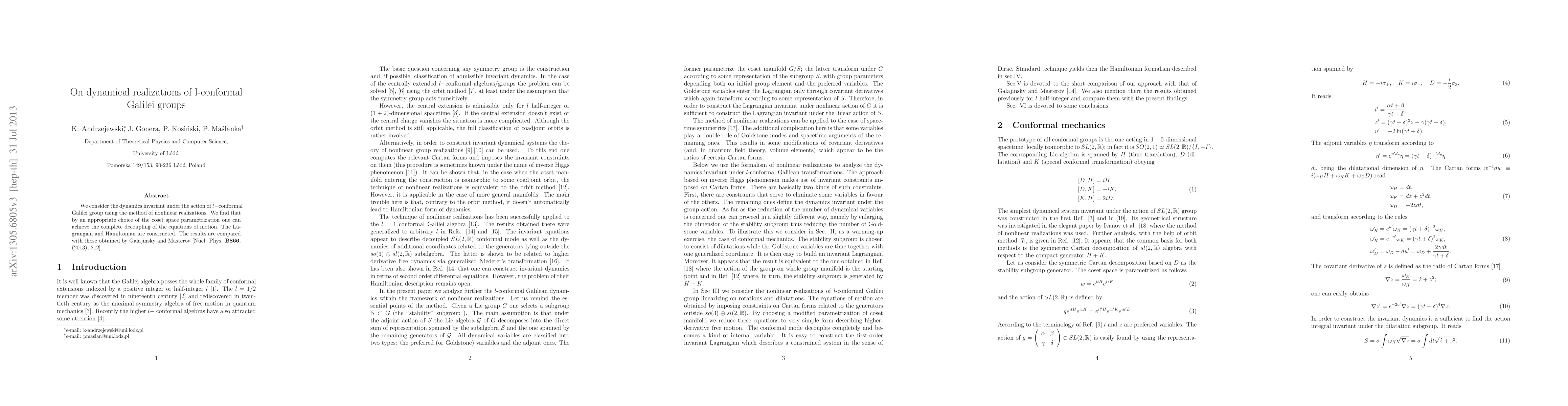 This paper explores the dynamics invariant under the l-conformal Galilei group through nonlinear realizations, achieving complete decoupling of equations of motion via coset space parametrization. The constructed Lagrangian and Hamiltonian are compared with previous results by Galajinsky and Masterov.
