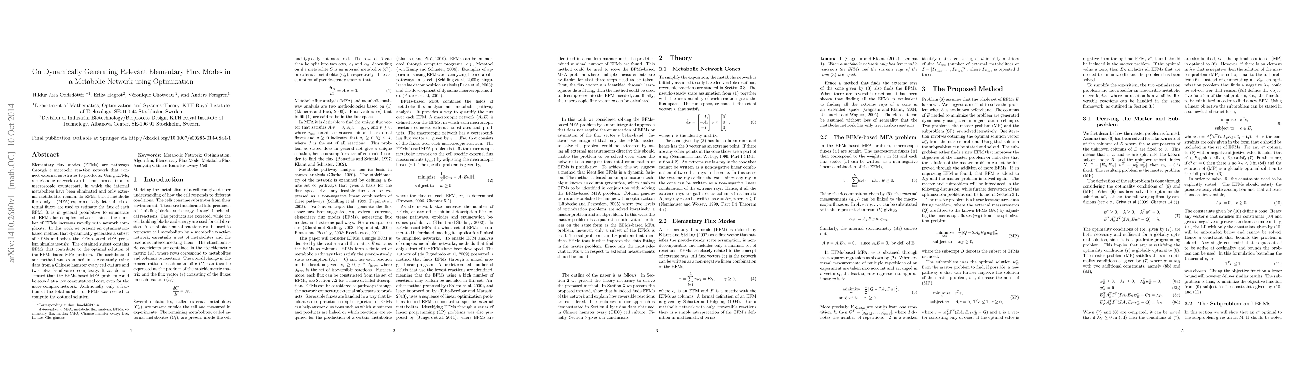 This paper presents an optimization-based method for dynamically generating relevant elementary flux modes (EFMs) in metabolic networks, enabling efficient EFMs-based metabolic flux analysis (MFA) even for complex networks. The method solves the MFA problem at a low computational cost by using only a subset of EFMs that contribute to the optimal solution.