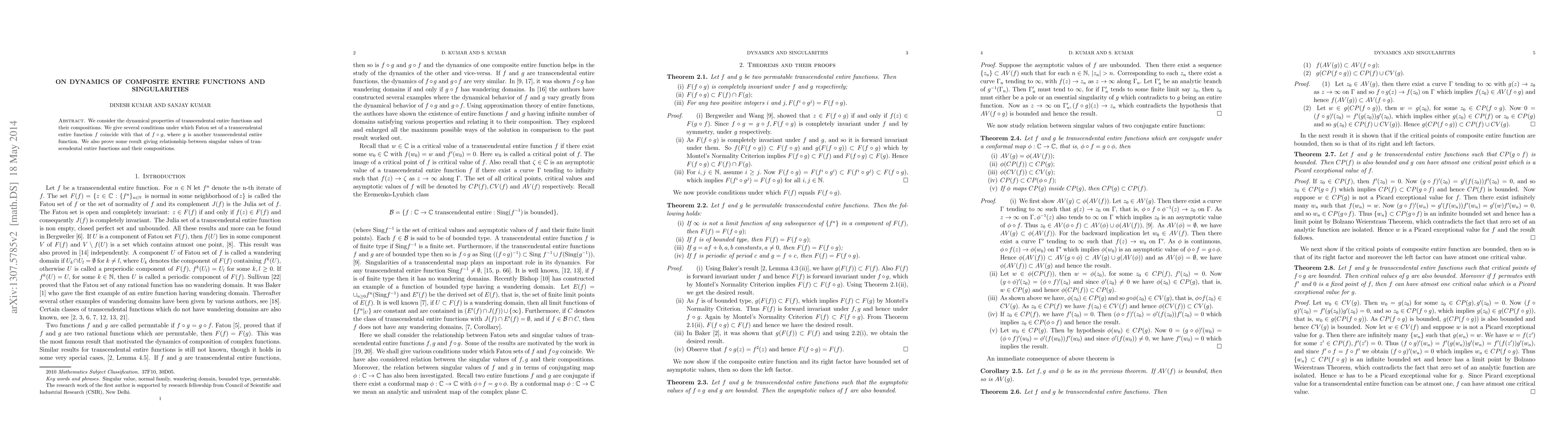 This paper investigates the dynamics of transcendental entire functions and their compositions, establishing conditions where the Fatou sets of $f$ and $f\circ g$ coincide, and explores relationships between the singular values of these functions and their compositions.