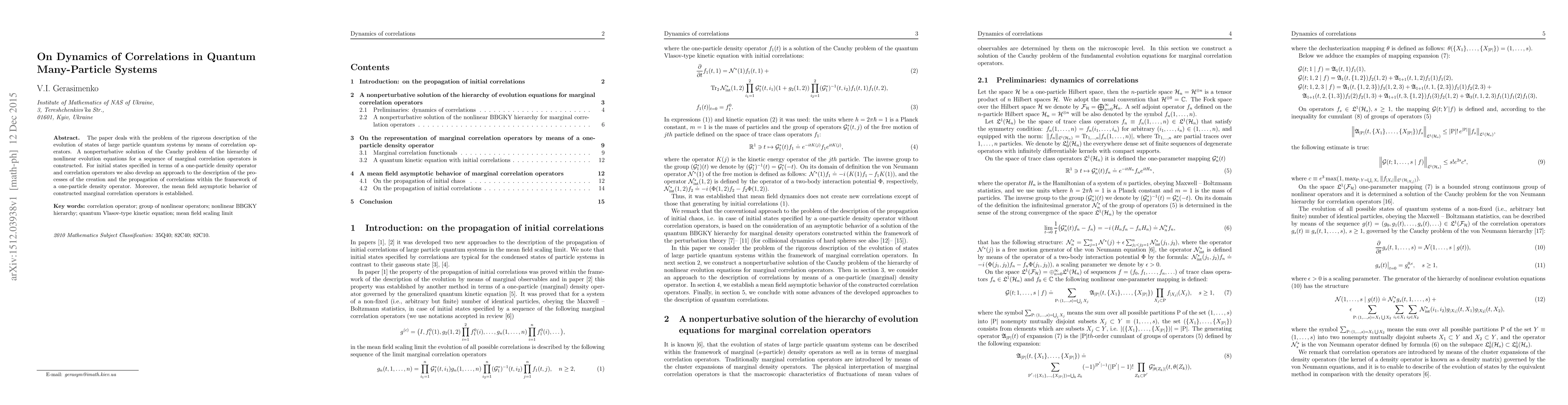 This paper constructs a nonperturbative solution for the evolution of quantum many-particle systems using correlation operators, detailing the creation and propagation of correlations from initial states defined by one-particle density and correlation operators, and establishes the mean field asymptotic behavior of these marginal correlation operators.