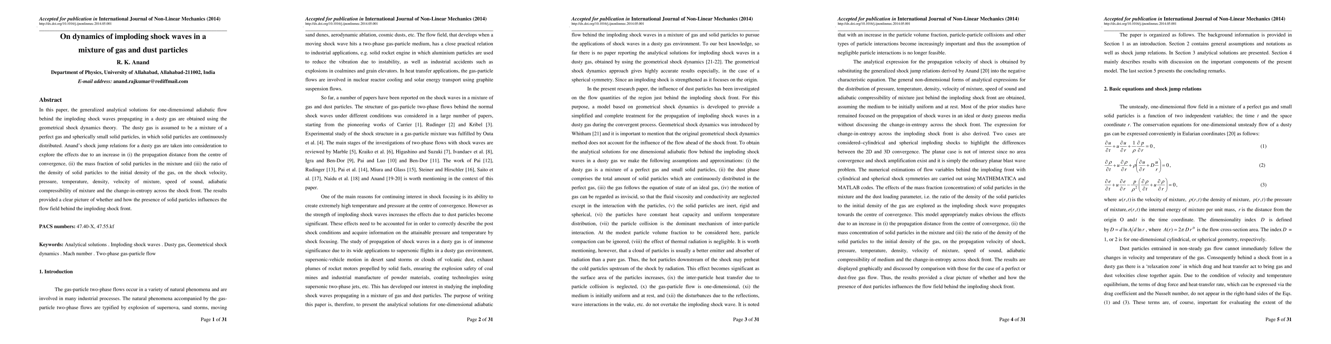This paper presents generalized analytical solutions for the dynamics of one-dimensional adiabatic flow behind imploding shock waves in a dusty gas mixture, using geometrical shock dynamics theory. It investigates the effects of shock propagation distance, mass fraction of solid particles, and particle density ratio on various shock properties, revealing the influence of solid particles on the flow field.