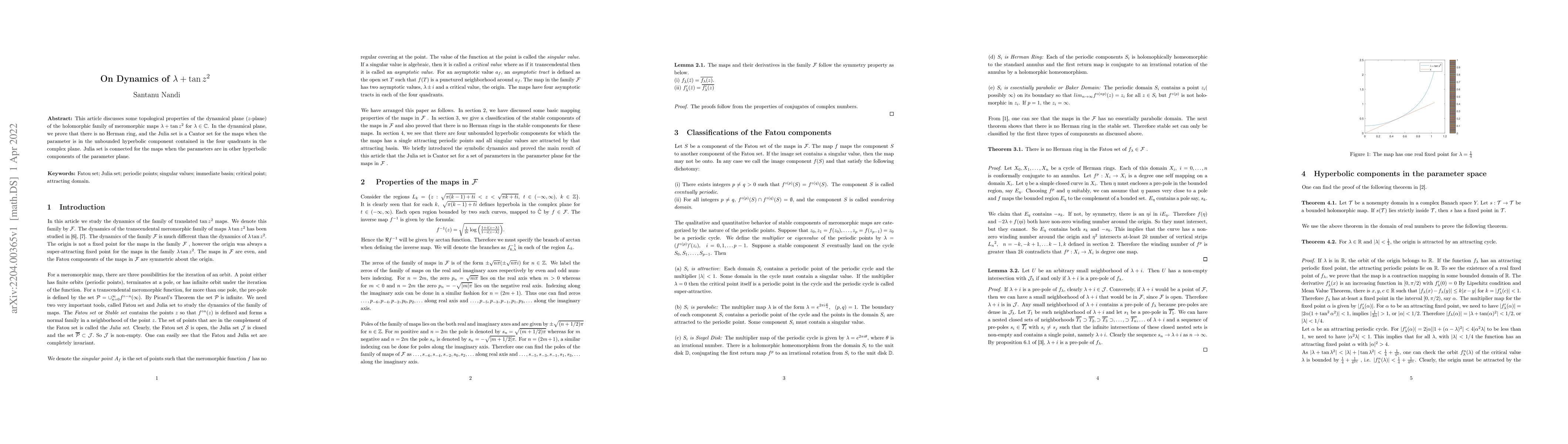 This article discusses some topological properties of the dynamical plane ($z$-plane) of the holomorphic family of meromorphic maps $\lambda + \tan z^2$ for $ \lambda \in \mathbb C$. In the dynamical plane, we prove that there is no Herman ring, and the Julia set is a Cantor set for the maps when the parameter is in the unbounded hyperbolic component contained in the four quadrants in the complex plane. Julia set is connected for the maps when the parameters are in other hyperbolic components of the parameter plane.