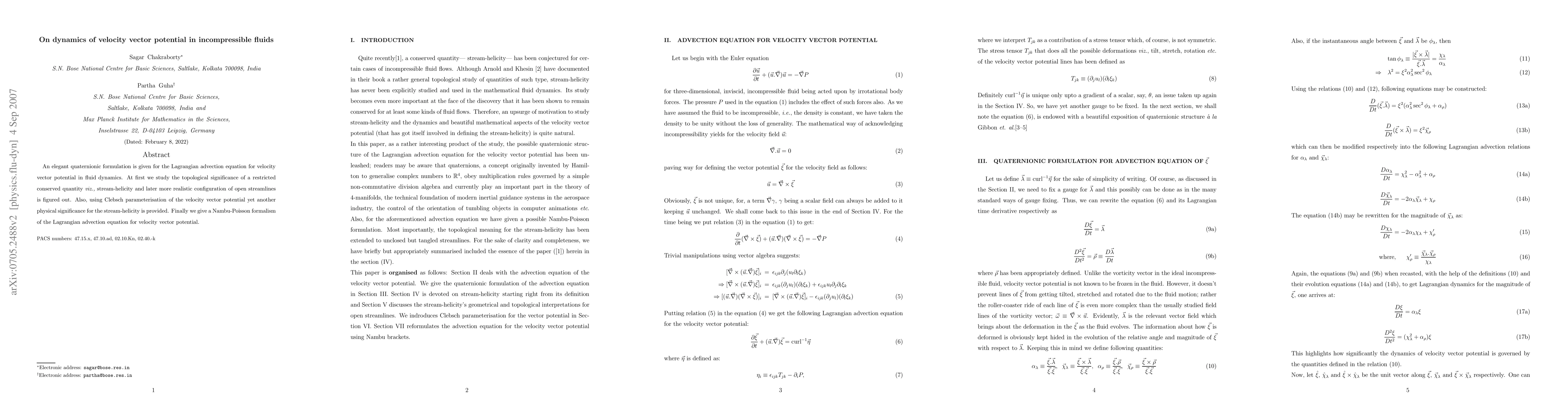 An elegant quaternionic formulation is given for the Lagrangian advection equation for velocity vector potential in fluid dynamics. At first we study the topological significance of a restricted conserved quantity viz., stream-helicity and later more realistic configuration of open streamlines is figured out. Also, using Clebsch parameterisation of the velocity vector potential yet another physical significance for the stream-helicity is provided. Finally we give a Nambu-Poisson formalism of the Lagrangian advection equation for velocity vector potential.