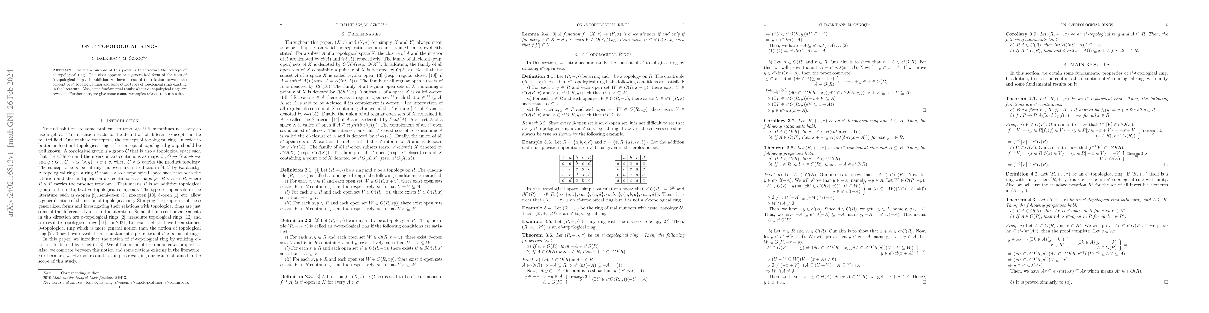 This paper introduces $e^*$-topological rings, a generalized form of $\beta$-topological rings, and explores their relationships with other types of topological rings. It also presents fundamental results and provides counterexamples to illustrate these findings.