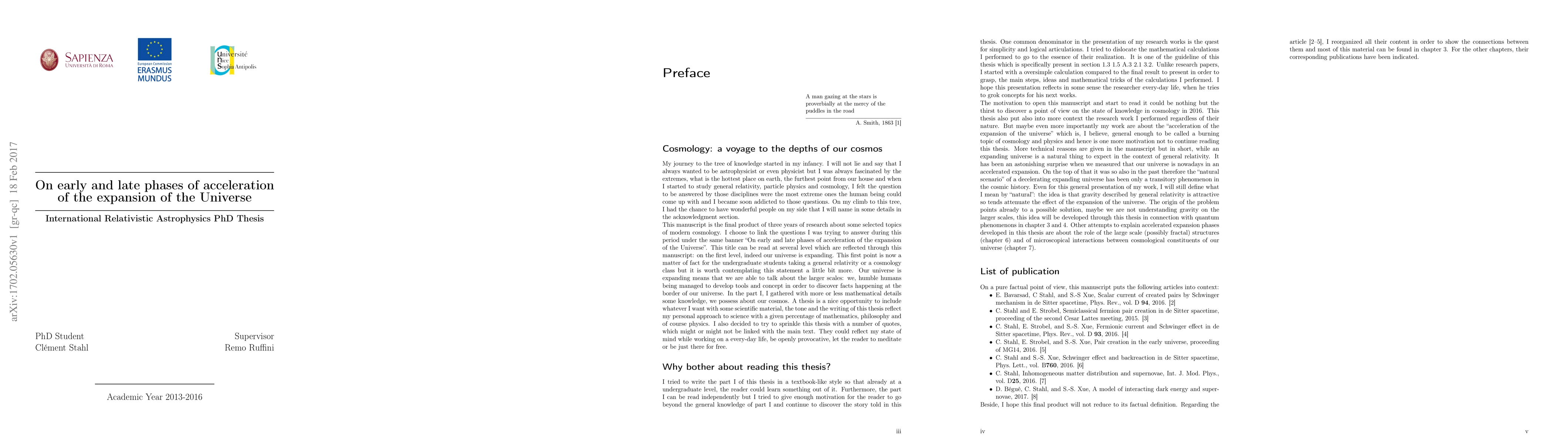 This thesis tackles the vast question of generating accelerated periods of expansion of the universe. Models loosely related were developed in the early and late universe. In the early universe, generalizations of the Schwinger effect were developed in curved (de Sitter) space and some backreaction effects were estimated. In the late universe, a fractal model was developed and confronted to supernovae data. This relies on the idea of an accelerated expanding universe being nothing but a mirage due to inhomogeneities disposed in a fractal (in this particular model) way. Finally a model of interacting energy based on an Einstein-Cartan gravitational theory was phenomenologically investigated.