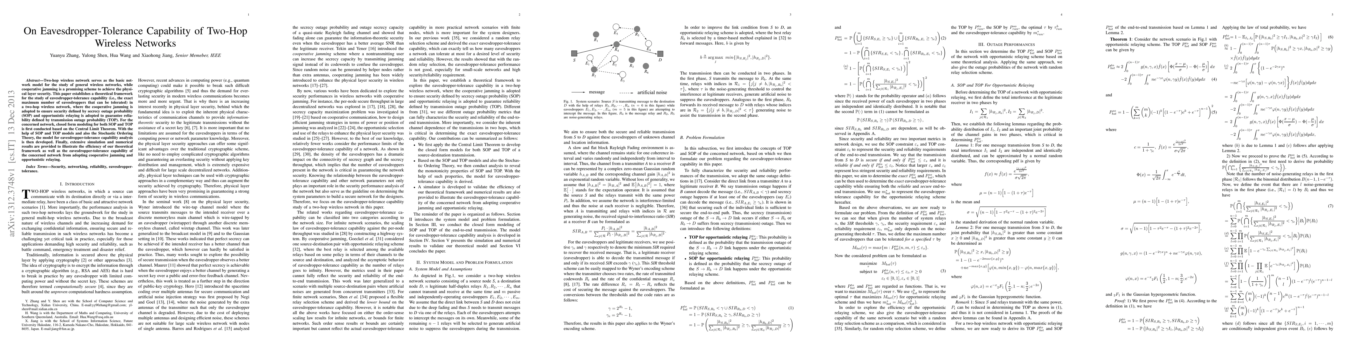 This paper develops a theoretical framework to analyze the eavesdropper-tolerance capability of two-hop wireless networks using cooperative jamming and opportunistic relaying. It provides closed-form models for secrecy and transmission outage probabilities and uses these to evaluate the network's ability to withstand eavesdropping.
