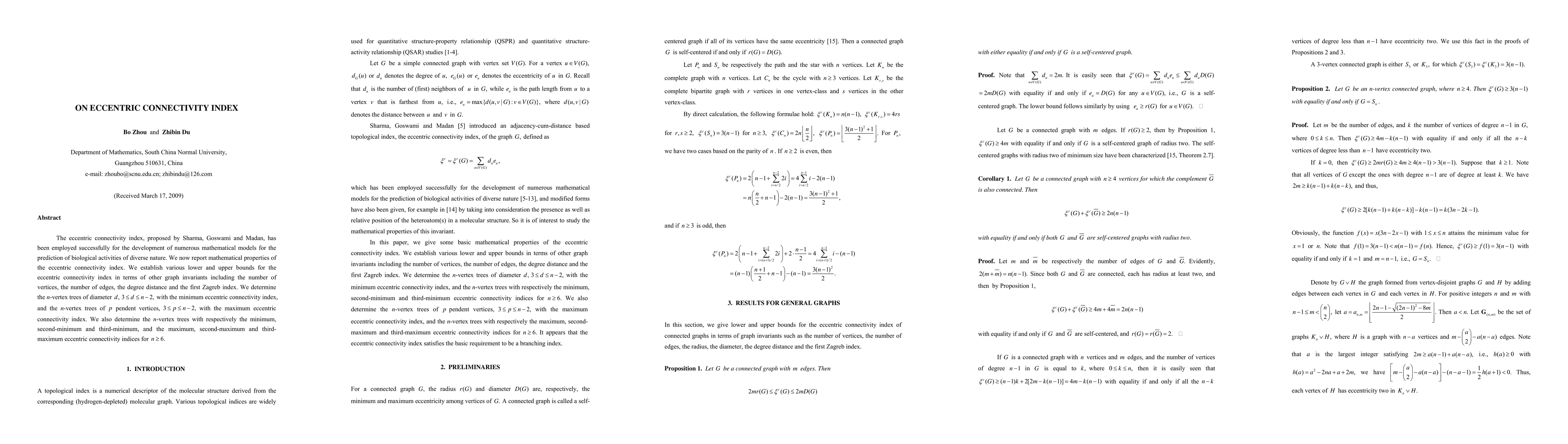 Summary: This paper explores the eccentric connectivity index, establishing mathematical properties and bounds in relation to other graph invariants. It identifies specific n-vertex trees with extremal eccentric connectivity indices, providing insights into their structural characteristics.