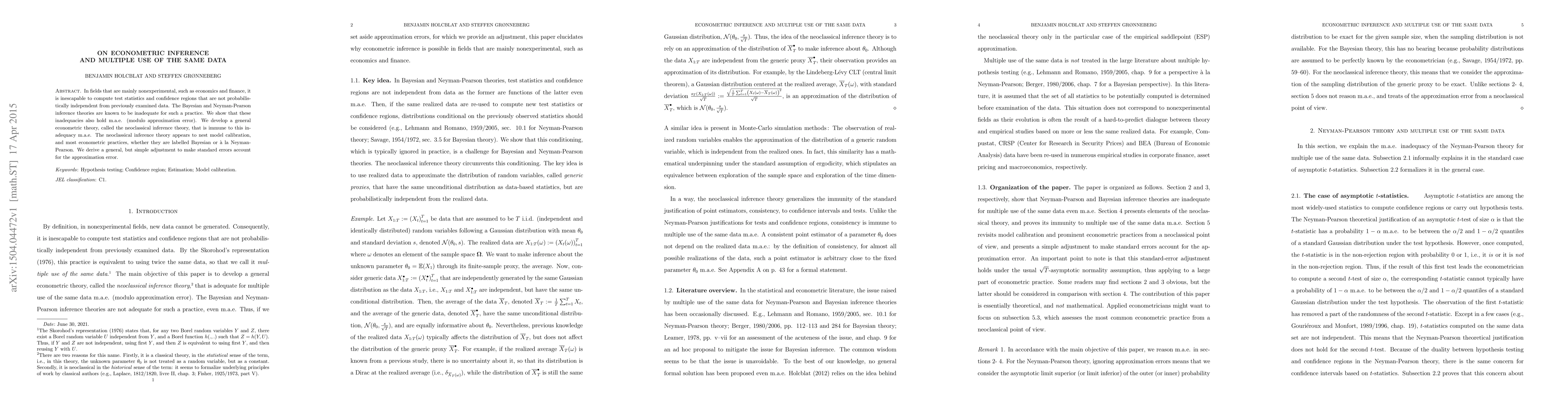 In fields that are mainly nonexperimental, such as economics and finance, it is inescapable to compute test statistics and confidence regions that are not probabilistically independent from previously examined data. The Bayesian and Neyman-Pearson inference theories are known to be inadequate for such a practice. We show that these inadequacies also hold m.a.e. (modulo approximation error). We develop a general econometric theory, called the neoclassical inference theory, that is immune to this inadequacy m.a.e. The neoclassical inference theory appears to nest model calibration, and most econometric practices, whether they are labelled Bayesian or \`a la Neyman-Pearson. We derive a general, but simple adjustment to make standard errors account for the approximation error.