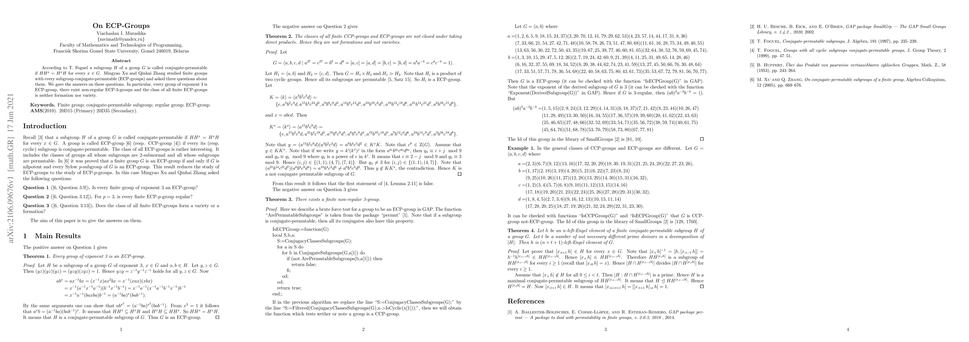 Summary: This paper answers three questions about ECP-groups, where every subgroup is conjugate-permutable. It confirms that groups of exponent 3 are ECP-groups, identifies non-regular ECP-$3$-groups, and concludes that the class of all finite ECP-groups is neither a formation nor a variety.