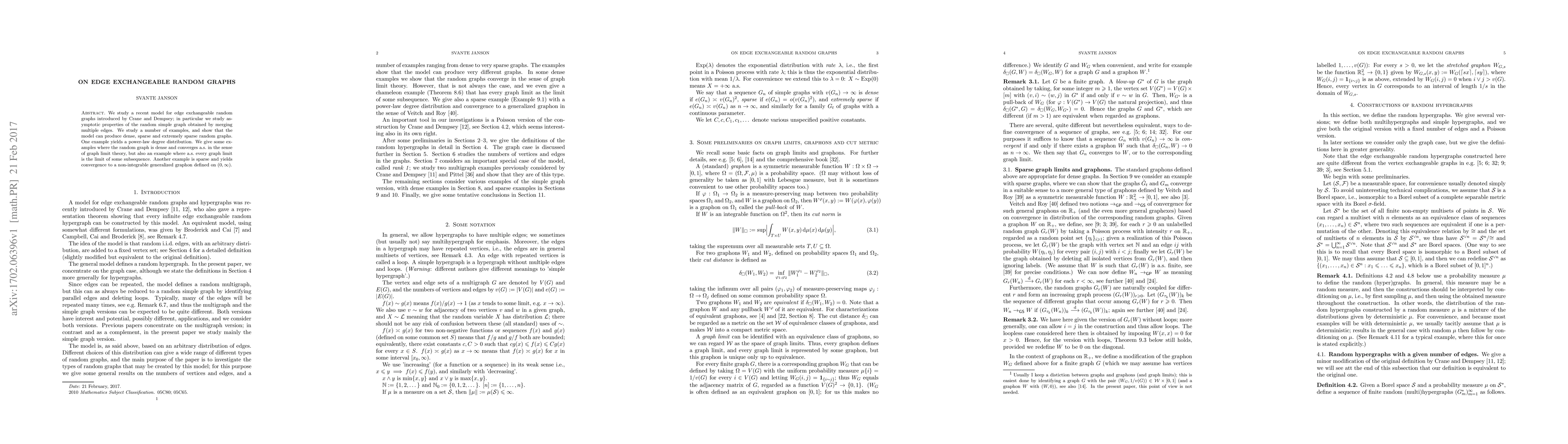 The paper studies edge exchangeable random graphs, focusing on asymptotic properties of the random simple graph obtained by merging multiple edges, using the model introduced by Crane and Dempsey.