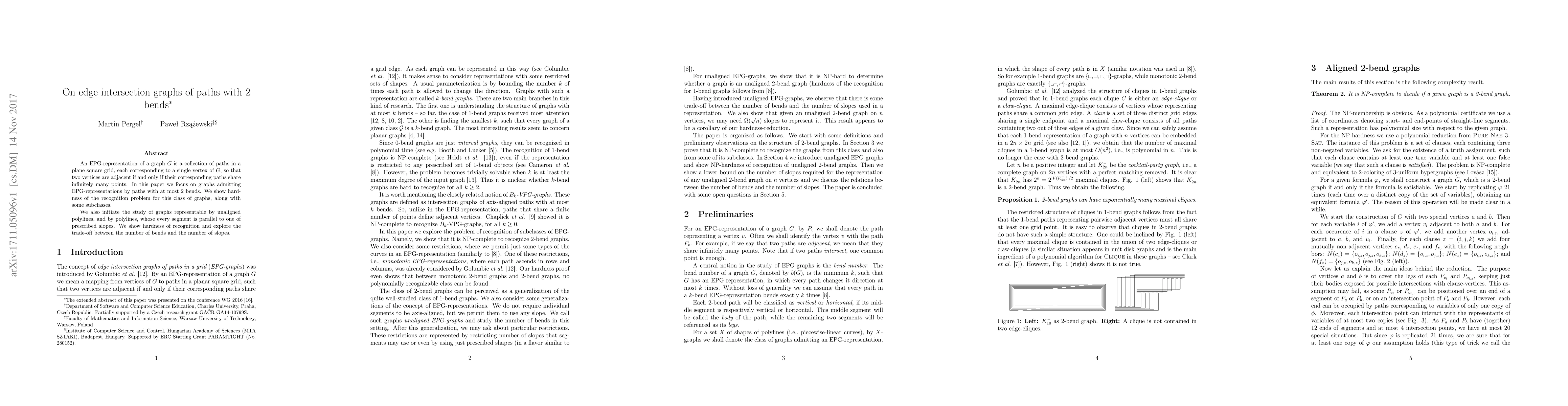 An EPG-representation of a graph $G$ is a collection of paths in a plane square grid, each corresponding to a single vertex of $G$, so that two vertices are adjacent if and only if their corresponding paths share infinitely many points. In this paper we focus on graphs admitting EPG-representations by paths with at most 2 bends. We show hardness of the recognition problem for this class of graphs, along with some subclasses. We also initiate the study of graphs representable by unaligned polylines, and by polylines, whose every segment is parallel to one of prescribed slopes. We show hardness of recognition and explore the trade-off between the number of bends and the number of slopes.