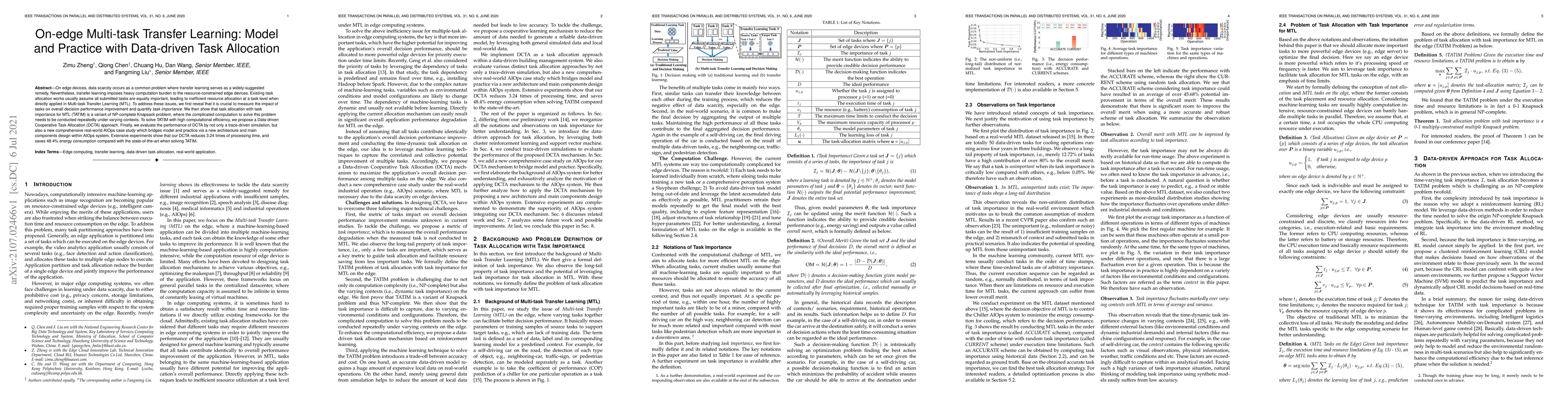 On edge devices, data scarcity occurs as a common problem where transfer learning serves as a widely-suggested remedy. Nevertheless, transfer learning imposes a heavy computation burden to resource-constrained edge devices. Existing task allocation works usually assume all submitted tasks are equally important, leading to inefficient resource allocation at a task level when directly applied in Multi-task Transfer Learning (MTL). To address these issues, we first reveal that it is crucial to measure the impact of tasks on overall decision performance improvement and quantify \emph{task importance}. We then show that task allocation with task importance for MTL (TATIM) is a variant of the NP-complete Knapsack problem, where the complicated computation to solve this problem needs to be conducted repeatedly under varying contexts. To solve TATIM with high computational efficiency, we propose a Data-driven Cooperative Task Allocation (DCTA) approach. Finally, we evaluate the performance of DCTA by not only a trace-driven simulation, but also a new comprehensive real-world AIOps case study that bridges model and practice via a new architecture and main components design within the AIOps system. Extensive experiments show that our DCTA reduces 3.24 times of processing time, and saves 48.4\% energy consumption compared with the state-of-the-art when solving TATIM.