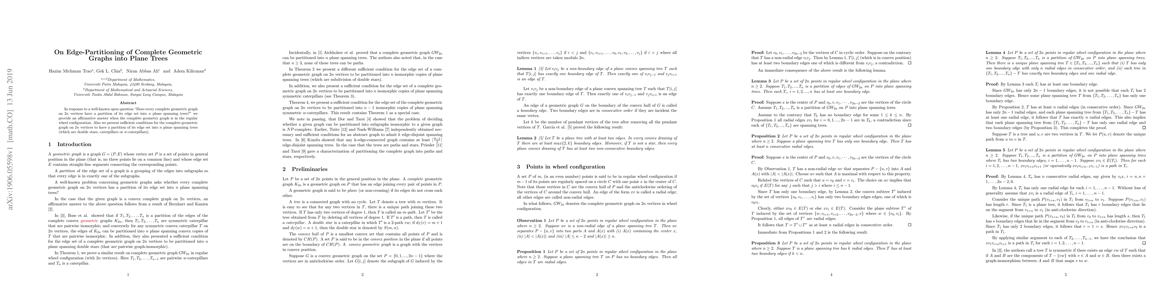 In response to a well-known open question ``Does every complete geometric graph on $2n\/$ vertices have a partition of its edge set into $n\/$ plane spanning trees?" we provide an affirmative answer when the complete geometry graph is in the regular wheel configuration. Also we present sufficient conditions for the complete geometric graph on $2n\/$ vertices to have a partition of its edge set into $n\/$ plane spanning trees (which are double stars, caterpillars or $ w\/$-caterpillars).