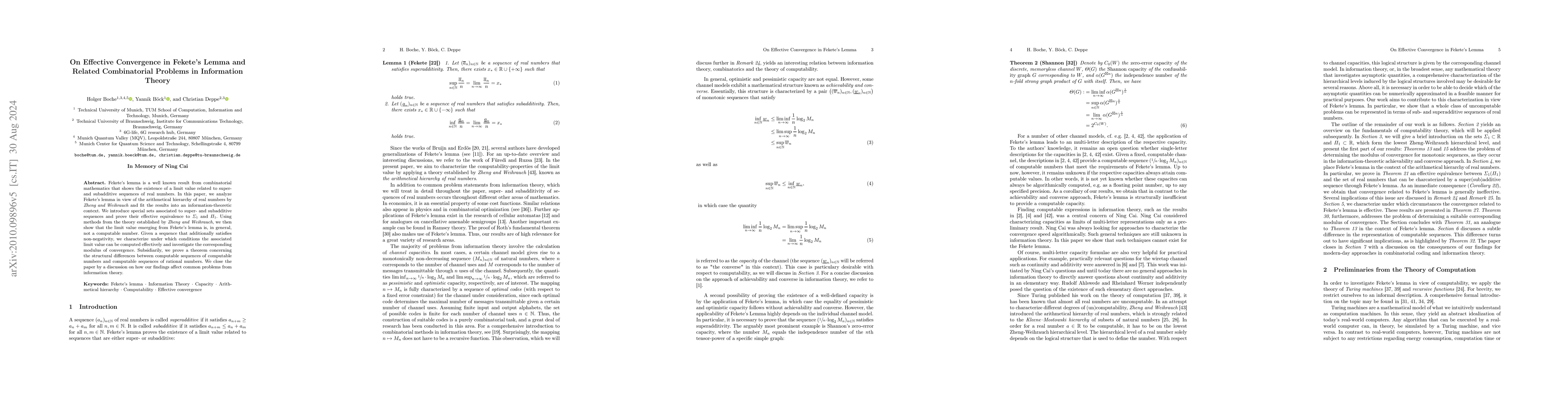 Fekete's lemma is a well known result from combinatorial mathematics that shows the existence of a limit value related to super- and subadditive sequences of real numbers. In this paper, we analyze Fekete's lemma in view of the arithmetical hierarchy of real numbers by \citeauthor{ZhWe01} and fit the results into an information theoretic-context. We introduce special sets associated to super- and subadditive sequences and prove their effective equivalence to $\Sigma_1$ and $\Pi_1$. Using methods from the theory established by \citeauthor{ZhWe01}, we then show that the limit value emerging from Fekete's lemma is, in general, not a computable number. Furthermore, we characterize under which conditions the limit value can be computed and investigate the corresponding modulus of convergence. We close the paper by a discussion on how our findings affect common problems from information theory.