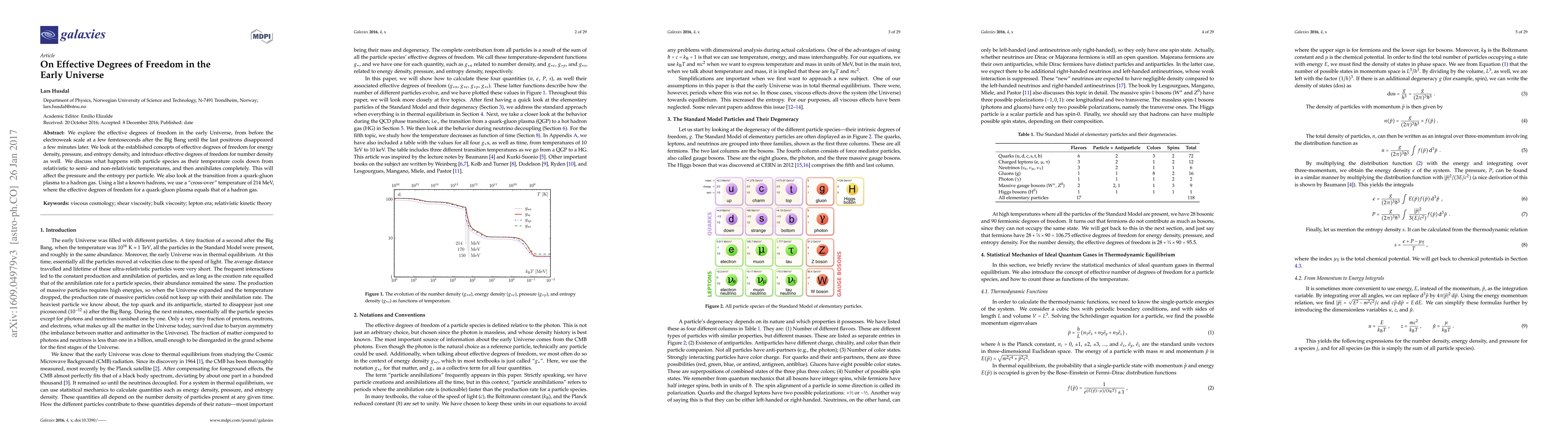 This paper investigates the effective degrees of freedom in the early universe, focusing on the transition from relativistic to non-relativistic temperatures and the consequent changes in energy density, pressure, and entropy. It introduces effective degrees of freedom for number density and examines the transition from a quark-gluon plasma to a hadron gas at a "cross-over" temperature of 214 MeV.