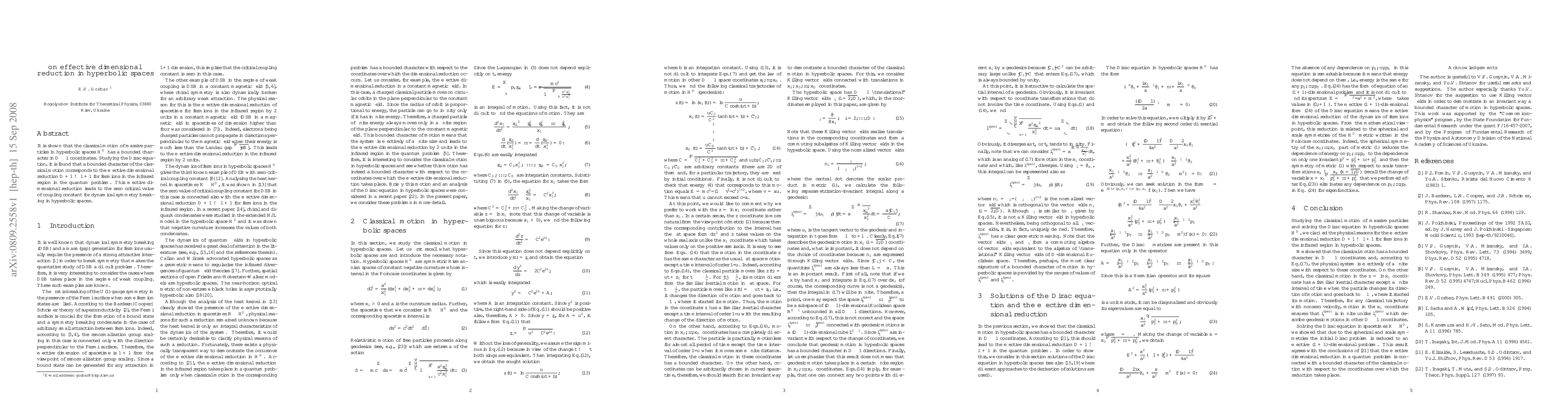 This paper demonstrates that classical particle motion in hyperbolic spaces $H^D$ can be effectively reduced to $D-1$ coordinates. It reveals that this reduction corresponds to a quantum dimensional reduction from $D+1$ to $1+1$ for fermions in the infrared region, resulting in a zero critical value for coupling constant in dynamical symmetry breaking.