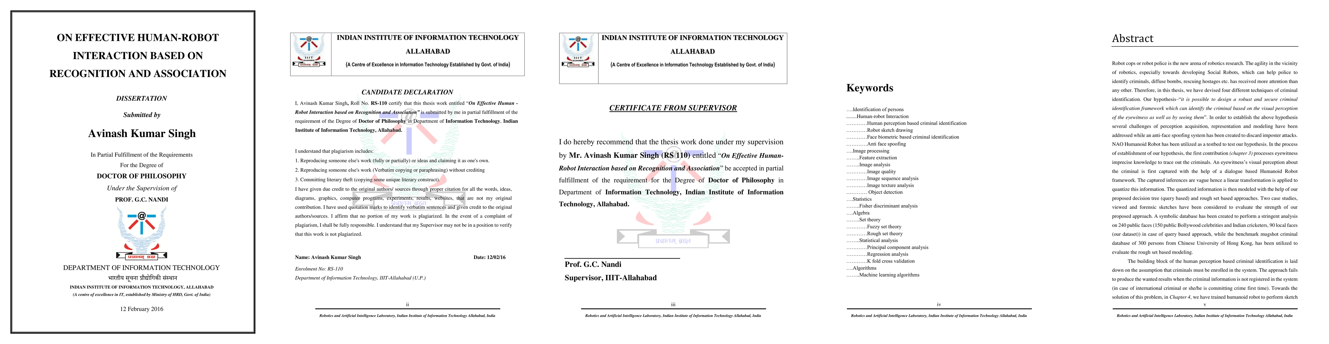 Faces play a magnificent role in human robot interaction, as they do in our daily life. The inherent ability of the human mind facilitates us to recognize a person by exploiting various challenges such as bad illumination, occlusions, pose variation etc. which are involved in face recognition. But it is a very complex task in nature to identify a human face by humanoid robots. The recent literatures on face biometric recognition are extremely rich in its application on structured environment for solving human identification problem. But the application of face biometric on mobile robotics is limited for its inability to produce accurate identification in uneven circumstances. The existing face recognition problem has been tackled with our proposed component based fragmented face recognition framework. The proposed framework uses only a subset of the full face such as eyes, nose and mouth to recognize a person. It's less searching cost, encouraging accuracy and ability to handle various challenges of face recognition offers its applicability on humanoid robots. The second problem in face recognition is the face spoofing, in which a face recognition system is not able to distinguish between a person and an imposter (photo/video of the genuine user). The problem will become more detrimental when robots are used as an authenticator. A depth analysis method has been investigated in our research work to test the liveness of imposters to discriminate them from the legitimate users. The implication of the previous earned techniques has been used with respect to criminal identification with NAO robot. An eyewitness can interact with NAO through a user interface. NAO asks several questions about the suspect, such as age, height, her/his facial shape and size etc., and then making a guess about her/his face.