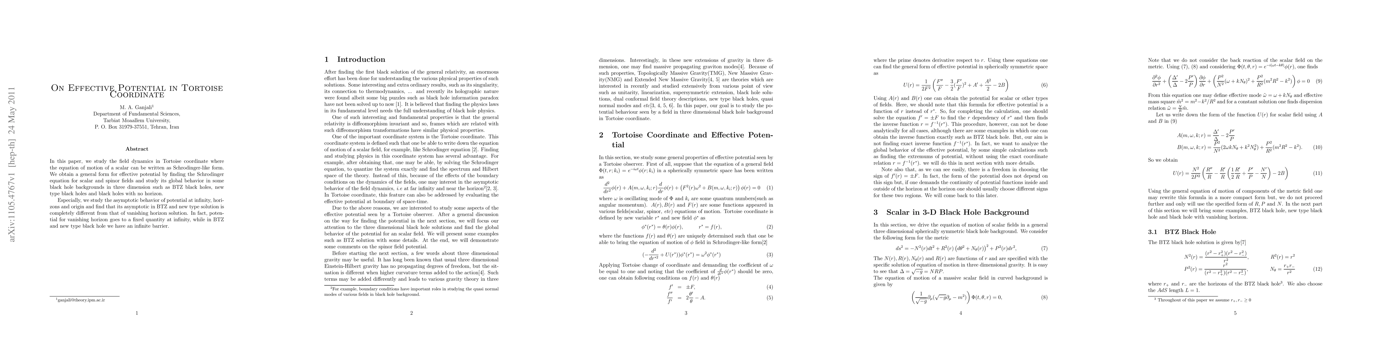 This paper investigates the dynamics of scalar fields in Tortoise coordinates using a Schrödinger-like equation, deriving an effective potential for both scalar and spinor fields. It finds distinct asymptotic behaviors of the potential in different three-dimensional black hole backgrounds, notably revealing infinite barriers in BTZ and new type black holes versus a fixed quantity in vanishing horizon solutions.