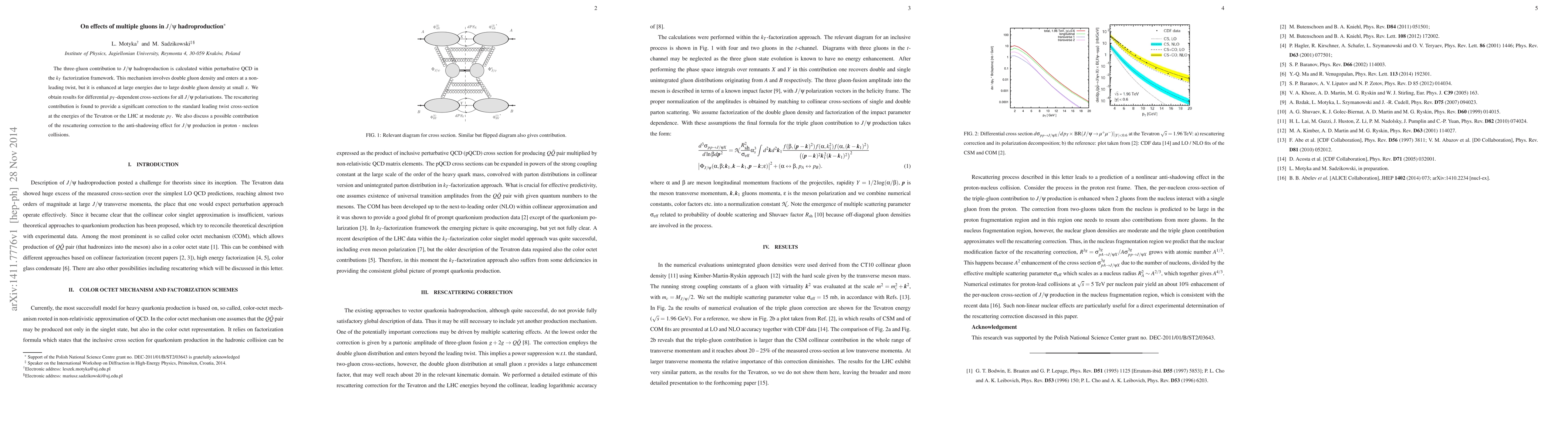 The three-gluon contribution to $J/\psi$ hadroproduction is calculated within perturbative QCD in the $k_T$ factorization framework. This mechanism involves double gluon density and enters at a non-leading twist, but it is enhanced at large energies due to large double gluon density at small $x$. We obtain results for differential $p_T$-dependent cross-sections for all $J/\psi$ polarisations. The rescattering contribution is found to provide a significant correction to the standard leading twist cross-section at the energies of the Tevatron or the LHC at moderate $p_T$. We also discuss a possible contribution of the rescattering correction to the anti-shadowing effect for $J/\psi$ production in proton - nucleus collisions.