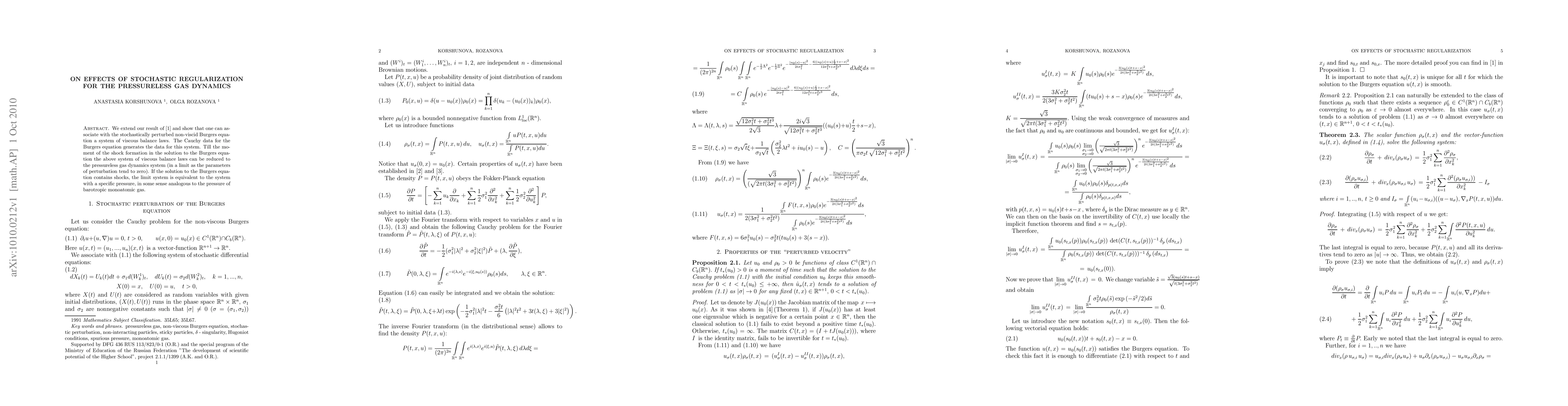 This research paper shows that a stochastically perturbed non-viscid Burgers equation can be associated with a system of viscous balance laws, which reduces to pressureless gas dynamics until shock formation.