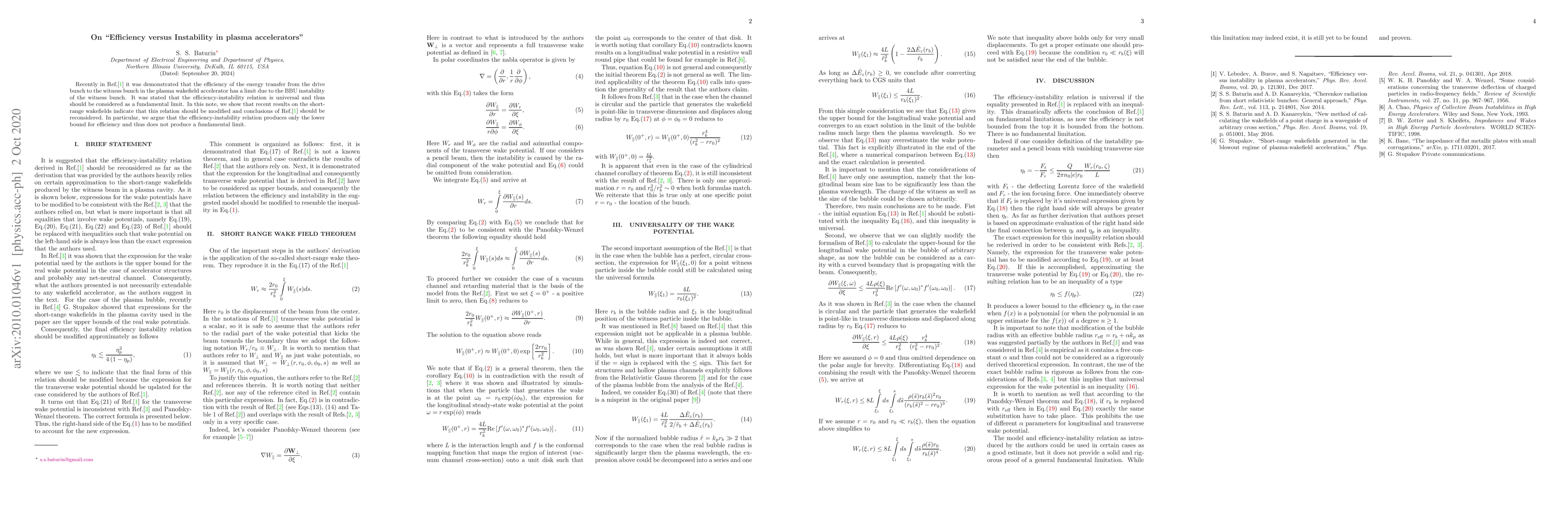 Recently in a paper by Lebedev et al it was demonstrated that the efficiency of the energy transfer from the drive bunch to the witness bunch in the plasma wakefield accelerator has a limit due to the BBU instability of the witness bunch. It was stated that the efficiency-instability relation is universal and thus should be considered as a fundamental limit. In this note, we show that recent results on the short-range wakefields indicate that this relation should be modified and conclusions of the paper by Lebedev et al should be reconsidered. In particular, we argue that the efficiency-instability relation produces only the lower bound for efficiency and thus does not produce a fundamental limit.