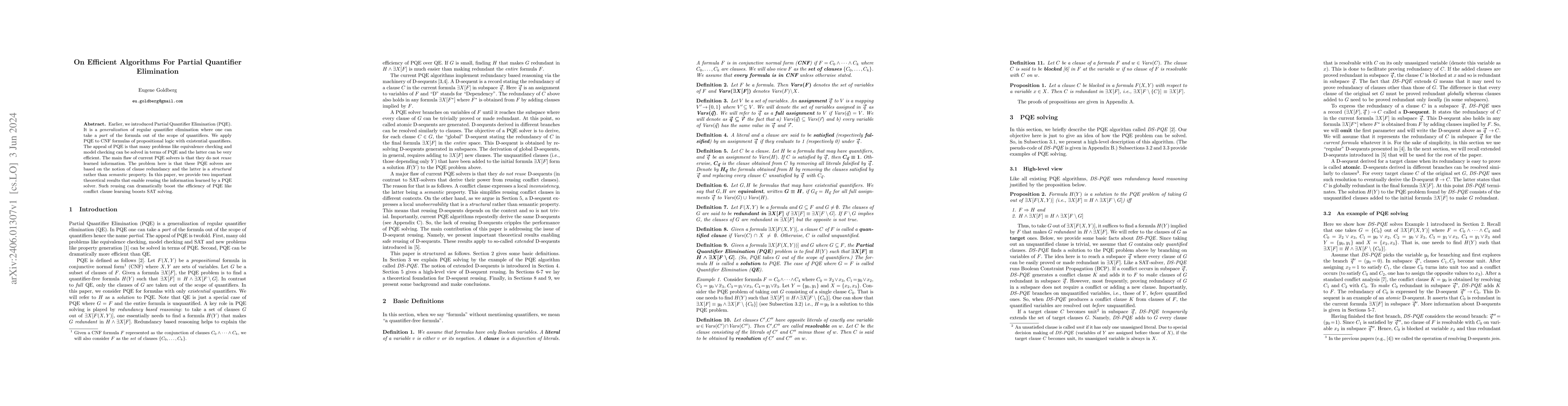 Earlier, we introduced Partial Quantifier Elimination (PQE). It is a $\mathit{generalization}$ of regular quantifier elimination where one can take a $\mathit{part}$ of the formula out of the scope of quantifiers. We apply PQE to CNF formulas of propositional logic with existential quantifiers. The appeal of PQE is that many problems like equivalence checking and model checking can be solved in terms of PQE and the latter can be very efficient. The main flaw of current PQE solvers is that they do not $\mathit{reuse}$ learned information. The problem here is that these PQE solvers are based on the notion of clause redundancy and the latter is a $\mathit{structural}$ rather than $\mathit{semantic}$ property. In this paper, we provide two important theoretical results that enable reusing the information learned by a PQE solver. Such reusing can dramatically boost the efficiency of PQE like conflict clause learning boosts SAT solving.