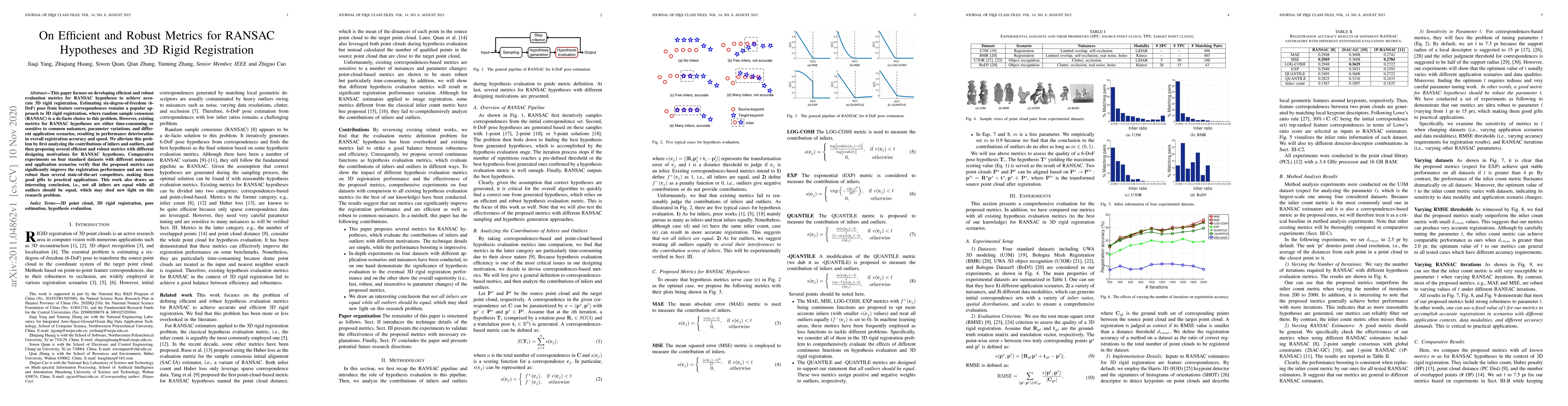 This paper focuses on developing efficient and robust evaluation metrics for RANSAC hypotheses to achieve accurate 3D rigid registration. Estimating six-degree-of-freedom (6-DoF) pose from feature correspondences remains a popular approach to 3D rigid registration, where random sample consensus (RANSAC) is a de-facto choice to this problem. However, existing metrics for RANSAC hypotheses are either time-consuming or sensitive to common nuisances, parameter variations, and different application scenarios, resulting in performance deterioration in overall registration accuracy and speed. We alleviate this problem by first analyzing the contributions of inliers and outliers, and then proposing several efficient and robust metrics with different designing motivations for RANSAC hypotheses. Comparative experiments on four standard datasets with different nuisances and application scenarios verify that the proposed metrics can significantly improve the registration performance and are more robust than several state-of-the-art competitors, making them good gifts to practical applications. This work also draws an interesting conclusion, i.e., not all inliers are equal while all outliers should be equal, which may shed new light on this research problem.