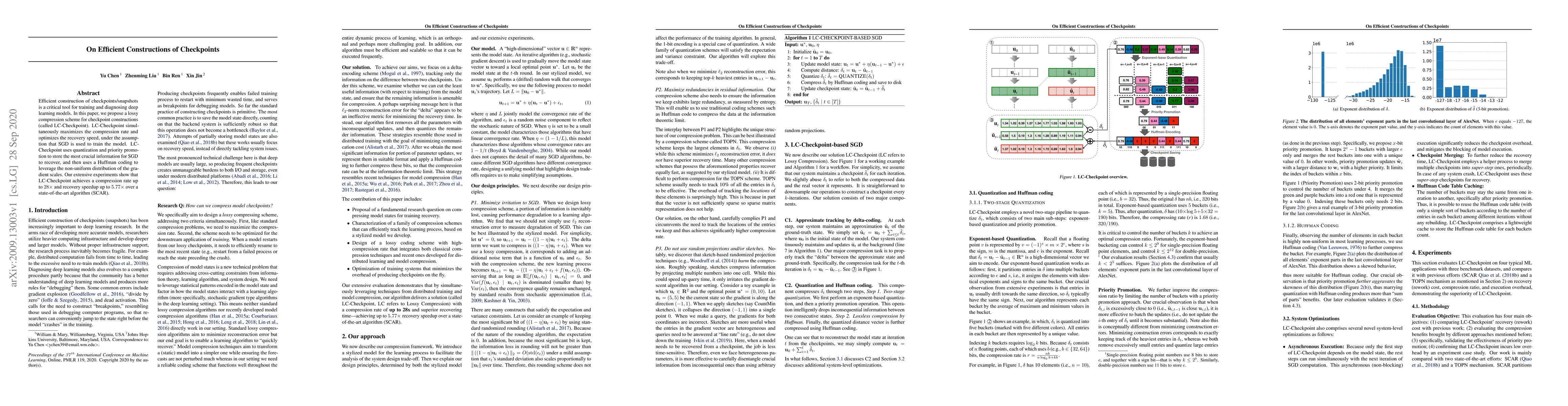 Efficient construction of checkpoints/snapshots is a critical tool for training and diagnosing deep learning models. In this paper, we propose a lossy compression scheme for checkpoint constructions (called LC-Checkpoint). LC-Checkpoint simultaneously maximizes the compression rate and optimizes the recovery speed, under the assumption that SGD is used to train the model. LC-Checkpointuses quantization and priority promotion to store the most crucial information for SGD to recover, and then uses a Huffman coding to leverage the non-uniform distribution of the gradient scales. Our extensive experiments show that LC-Checkpoint achieves a compression rate up to $28\times$ and recovery speedup up to $5.77\times$ over a state-of-the-art algorithm (SCAR).