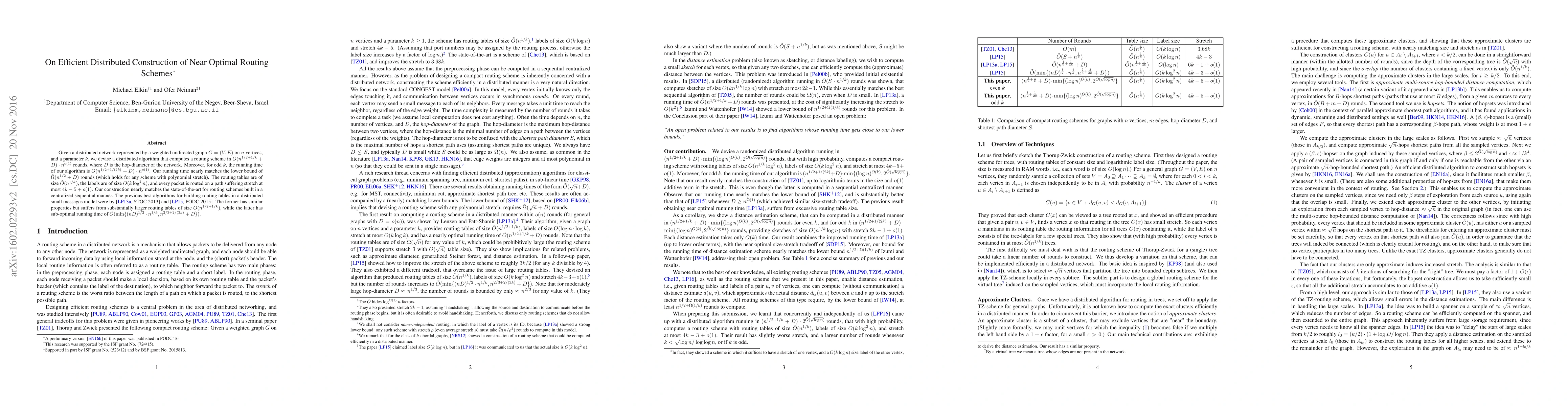 Given a distributed network represented by a weighted undirected graph $G=(V,E)$ on $n$ vertices, and a parameter $k$, we devise a distributed algorithm that computes a routing scheme in $(n^{1/2+1/k}+D)\cdot n^{o(1)}$ rounds, where $D$ is the hop-diameter of the network. The running time matches the lower bound of $\tilde{\Omega}(n^{1/2}+D)$ rounds (which holds for any scheme with polynomial stretch), up to lower order terms. The routing tables are of size $\tilde{O}(n^{1/k})$, the labels are of size $O(k\log^2n)$, and every packet is routed on a path suffering stretch at most $4k-5+o(1)$. Our construction nearly matches the state-of-the-art for routing schemes built in a centralized sequential manner. The previous best algorithms for building routing tables in a distributed small messages model were by \cite[STOC 2013]{LP13} and \cite[PODC 2015]{LP15}. The former has similar properties but suffers from substantially larger routing tables of size $O(n^{1/2+1/k})$, while the latter has sub-optimal running time of $\tilde{O}(\min\{(nD)^{1/2}\cdot n^{1/k},n^{2/3+2/(3k)}+D\})$.