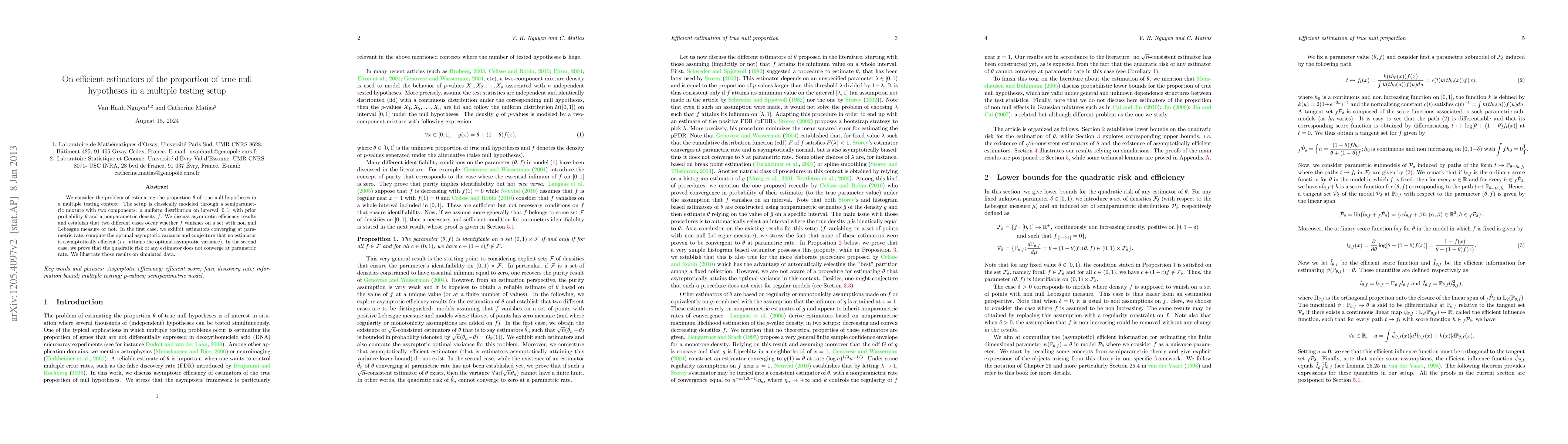 This paper explores efficient estimators for the proportion of true null hypotheses in multiple testing, showing that asymptotic efficiency depends on whether the underlying nonparametric density vanishes on a set with non-null Lebesgue measure. The authors find that in the first case, estimators converge at parametric rate but are conjectured to be non-asymptotically efficient, while in the second case, no estimator converges at parametric rate.