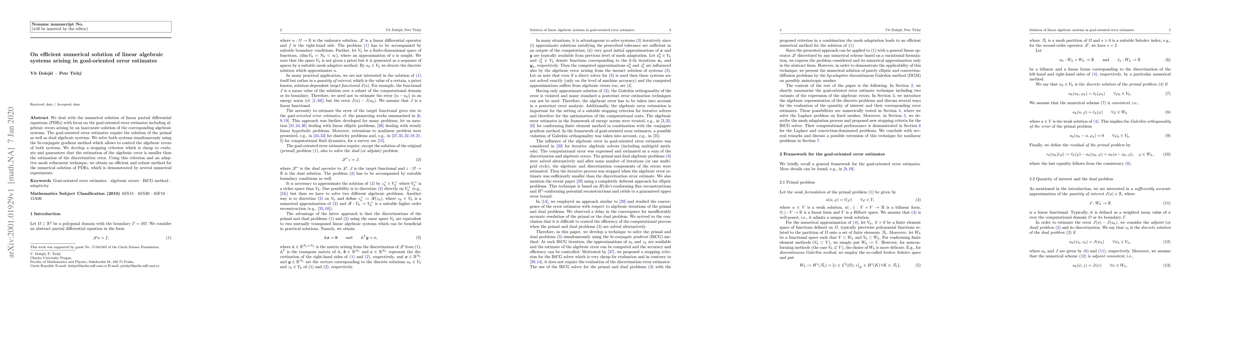 This paper proposes an efficient numerical method for solving linear algebraic systems in goal-oriented error estimation for PDEs, employing the bi-conjugate gradient method to solve primal and dual systems simultaneously. An adaptive stopping criterion is developed to ensure accurate error estimation, leading to an effective and robust solution technique validated through numerical experiments.