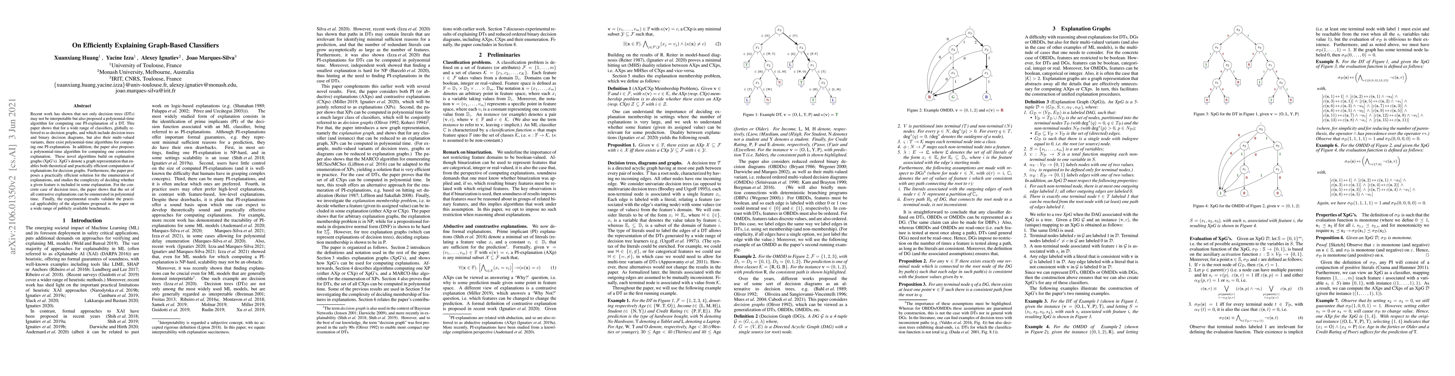 Recent work has shown that not only decision trees (DTs) may not be interpretable but also proposed a polynomial-time algorithm for computing one PI-explanation of a DT. This paper shows that for a wide range of classifiers, globally referred to as decision graphs, and which include decision trees and binary decision diagrams, but also their multi-valued variants, there exist polynomial-time algorithms for computing one PI-explanation. In addition, the paper also proposes a polynomial-time algorithm for computing one contrastive explanation. These novel algorithms build on explanation graphs (XpG's). XpG's denote a graph representation that enables both theoretical and practically efficient computation of explanations for decision graphs. Furthermore, the paper proposes a practically efficient solution for the enumeration of explanations, and studies the complexity of deciding whether a given feature is included in some explanation. For the concrete case of decision trees, the paper shows that the set of all contrastive explanations can be enumerated in polynomial time. Finally, the experimental results validate the practical applicability of the algorithms proposed in the paper on a wide range of publicly available benchmarks.