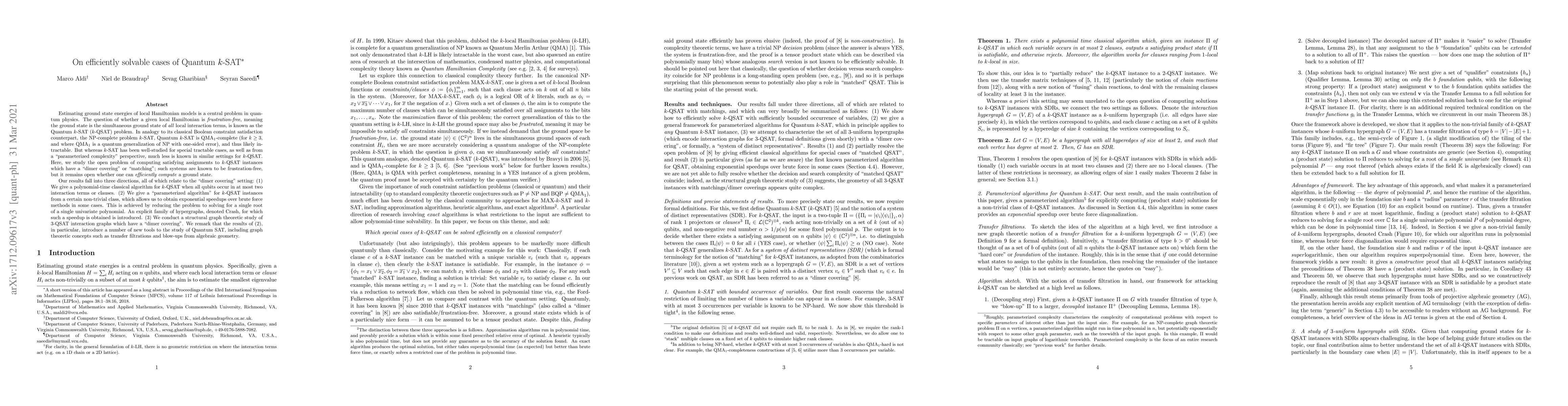 The constraint satisfaction problems k-SAT and Quantum k-SAT (k-QSAT) are canonical NP-complete and QMA_1-complete problems (for k>=3), respectively, where QMA_1 is a quantum generalization of NP with one-sided error. Whereas k-SAT has been well-studied for special tractable cases, as well as from a parameterized complexity perspective, much less is known in similar settings for k-QSAT. Here, we study the open problem of computing satisfying assignments to k-QSAT instances which have a "matching" or "dimer covering"; this is an NP problem whose decision variant is trivial, but whose search complexity remains open. Our results fall into three directions, all of which relate to the "matching" setting: (1) We give a polynomial-time classical algorithm for k-QSAT when all qubits occur in at most two clauses. (2) We give a parameterized algorithm for k-QSAT instances from a certain non-trivial class, which allows us to obtain exponential speedups over brute force methods in some cases. This is achieved by reducing the problem to solving for a single root of a single univariate polynomial. (3) We conduct a structural graph theoretic study of 3-QSAT interaction graphs which have a "matching". We remark that the results of (2), in particular, introduce a number of new tools to the study of Quantum SAT, including graph theoretic concepts such as transfer filtrations and blow-ups from algebraic geometry.