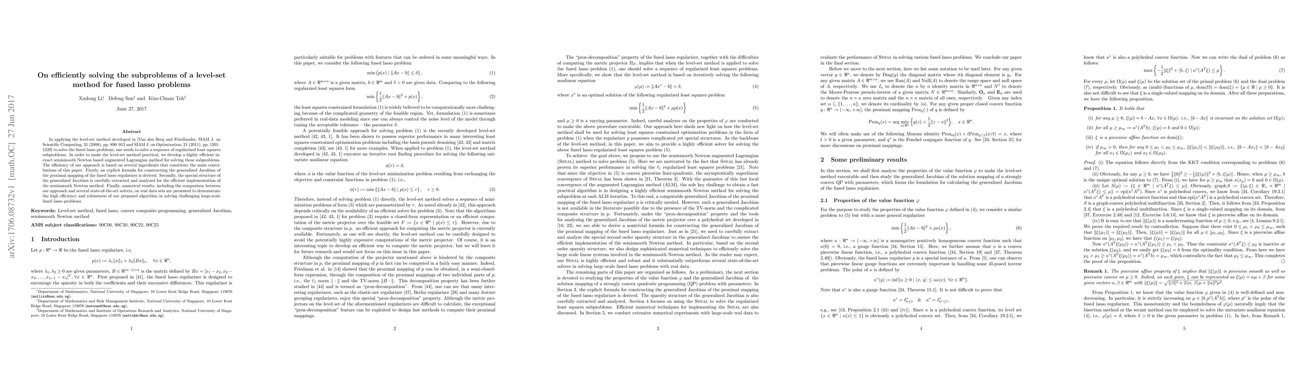 In applying the level-set method developed in [Van den Berg and Friedlander, SIAM J. on Scientific Computing, 31 (2008), pp.~890--912 and SIAM J. on Optimization, 21 (2011), pp.~1201--1229] to solve the fused lasso problems, one needs to solve a sequence of regularized least squares subproblems. In order to make the level-set method practical, we develop a highly efficient inexact semismooth Newton based augmented Lagrangian method for solving these subproblems. The efficiency of our approach is based on several ingredients that constitute the main contributions of this paper. Firstly, an explicit formula for constructing the generalized Jacobian of the proximal mapping of the fused lasso regularizer is derived. Secondly, the special structure of the generalized Jacobian is carefully extracted and analyzed for the efficient implementation of the semismooth Newton method. Finally, numerical results, including the comparison between our approach and several state-of-the-art solvers, on real data sets are presented to demonstrate the high efficiency and robustness of our proposed algorithm in solving challenging large-scale fused lasso problems.