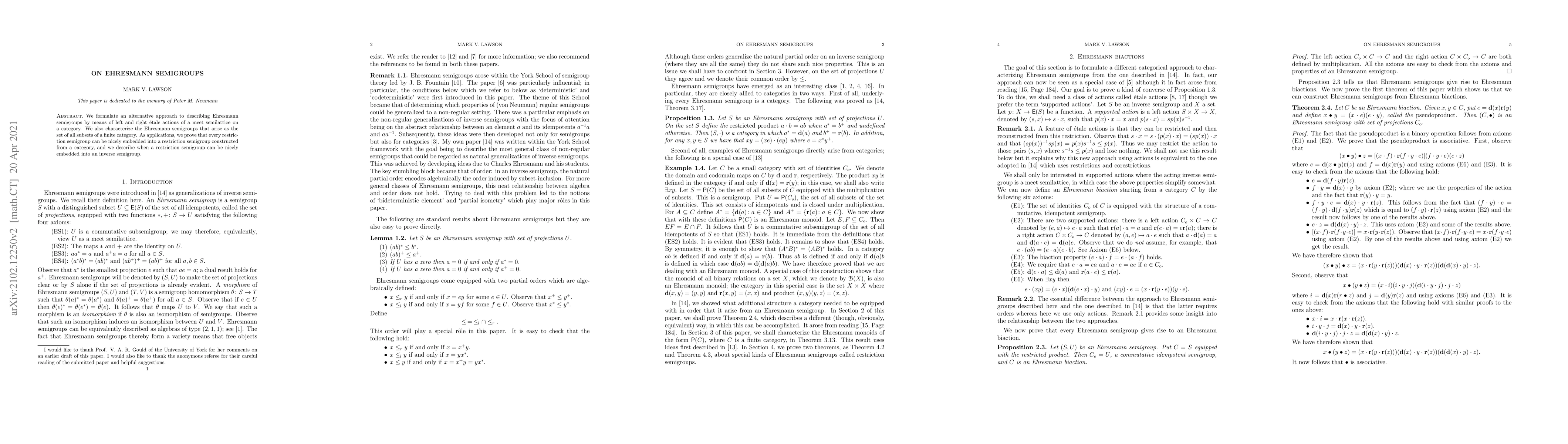 We formulate an alternative approach to describing Ehresmann semigroups by means of left and right \'etale actions of a meet semilattice on a category. We also characterize the Ehresmann semigroups that arise as the set of all subsets of a finite category. As applications, we prove that every restriction semigroup can be nicely embedded into a restriction semigroup constructed from a category, and we describe when a restriction semigroup can be nicely embedded into an inverse semigroup.