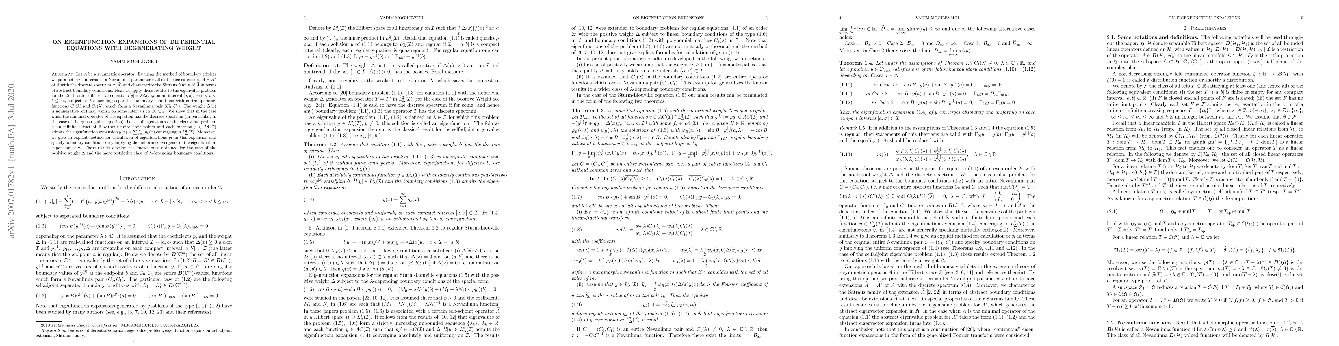 This paper explores eigenfunction expansions of differential equations with degenerating weight using the boundary triplets method. It characterizes the Shtraus family of extensions and applies these results to a $2r$-th order differential equation with $\l$-dependent boundary conditions, showing that eigenfunction expansions converge under certain conditions.