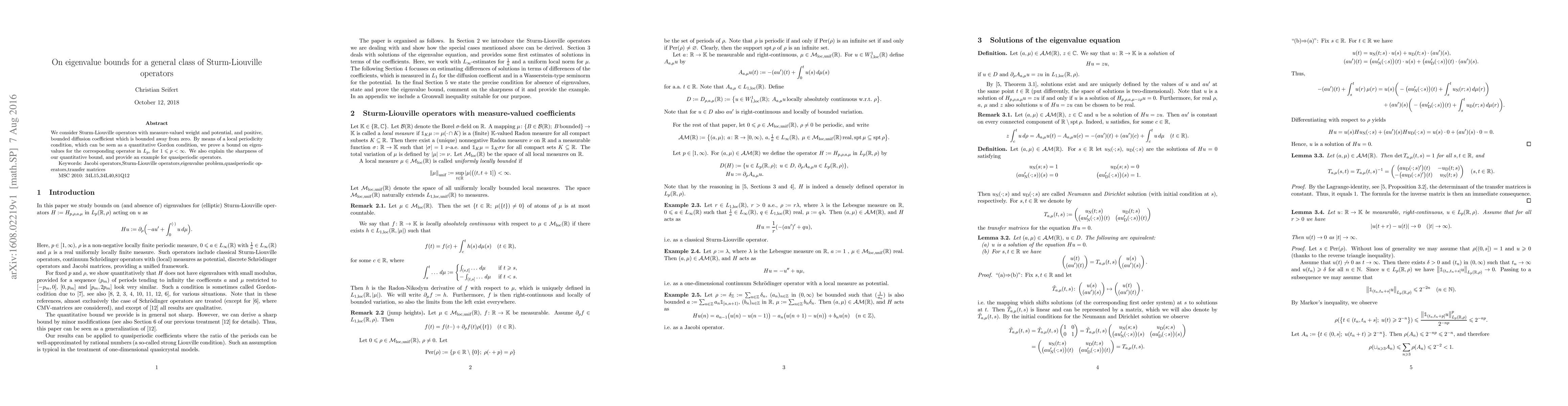 We consider Sturm-Liouville operators with measure-valued weight and potential, and positive, bounded diffusion coefficient which is bounded away from zero. By means of a local periodicity condition, which can be seen as a quantitative Gordon condition, we prove a bound on eigenvalues for the corresponding operator in $L_p$, for $1\leq p<\infty$. We also explain the sharpness of our quantitative bound, and provide an example for quasiperiodic operators.