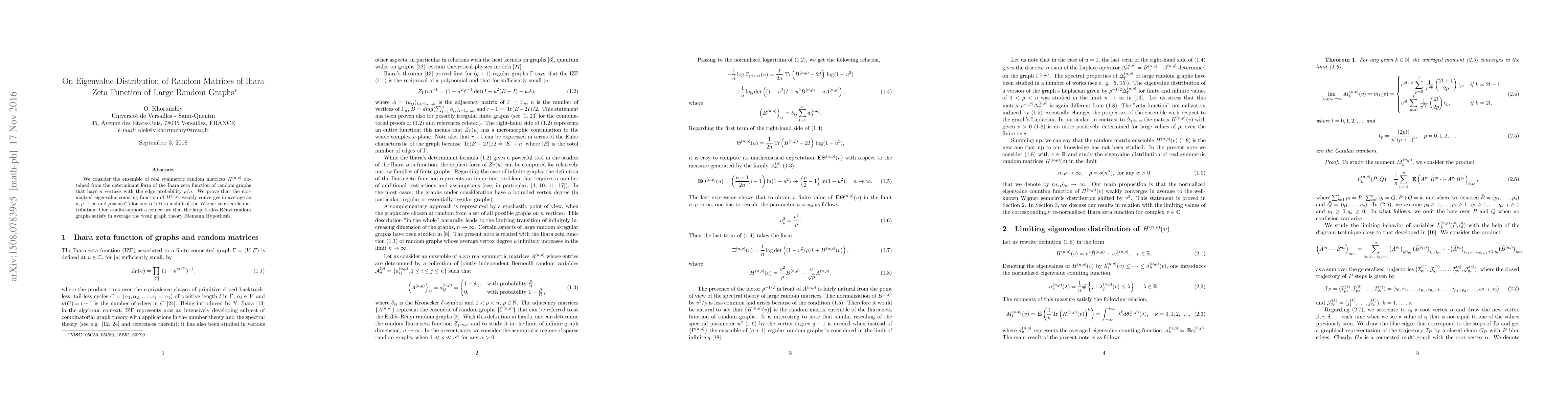 We consider the ensemble of real symmetric random matrices $H^{(n,\rho)}$ obtained from the determinant form of the Ihara zeta function of random graphs that have $n$ vertices with the edge probability $\rho/n$. We prove that the normalized eigenvalue counting function of $H^{(n,\rho)}$ weakly converges in average as $n,\rho\to\infty$ and $\rho=o(n^\alpha)$ for any $\alpha>0$ to a shift of the Wigner semi-circle distribution. Our results support a conjecture that the large Erdos-R\'enyi random graphs satisfy in average the weak graph theory Riemann Hypothesis.