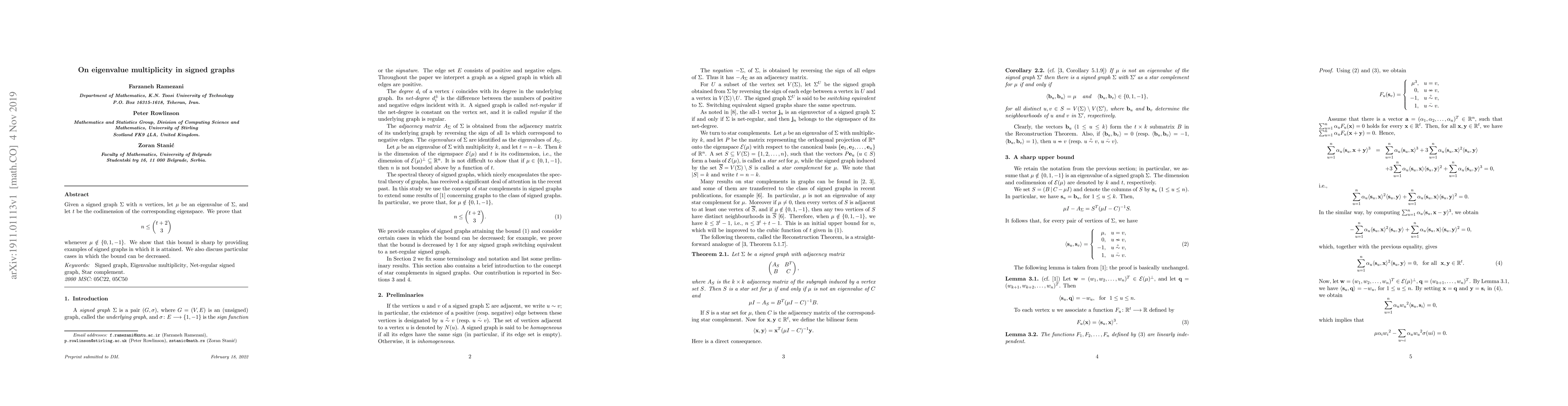 The paper provides a cubic polynomial upper bound on the multiplicity of eigenvalues for signed graphs, demonstrating its sharpness with examples and discussing particular cases where the bound can be decreased.