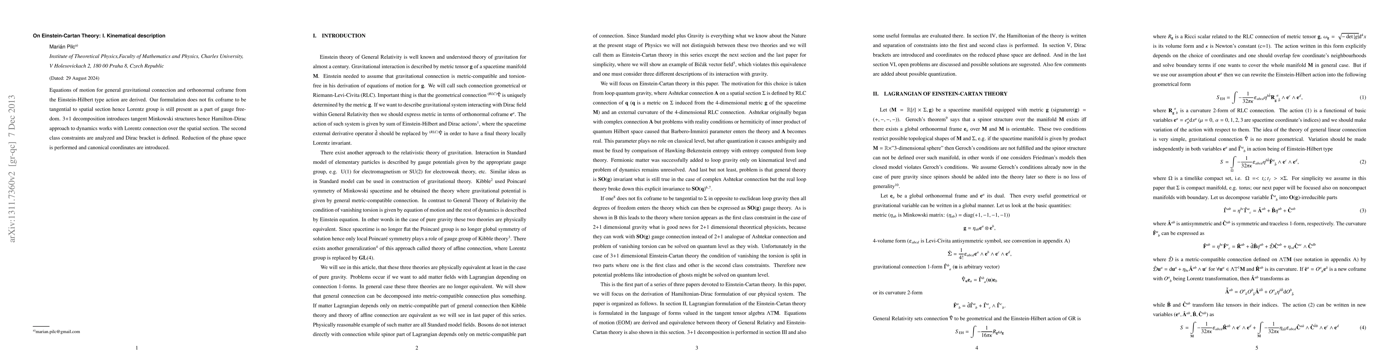 Equations of motion for general gravitational connection and orthonormal coframe from the Einstein-Hilbert type action are derived. Our formulation does not fix coframe to be tangential to spatial section hence Lorentz group is still present as a part of gauge freedom. 3+1 decomposition introduces tangent Minkowski structures hence Hamilton-Dirac approach to dynamics works with Lorentz connection over the spatial section. The second class constraints are analyzed and Dirac bracket is defined. Reduction of the phase space is performed and canonical coordinates are introduced.